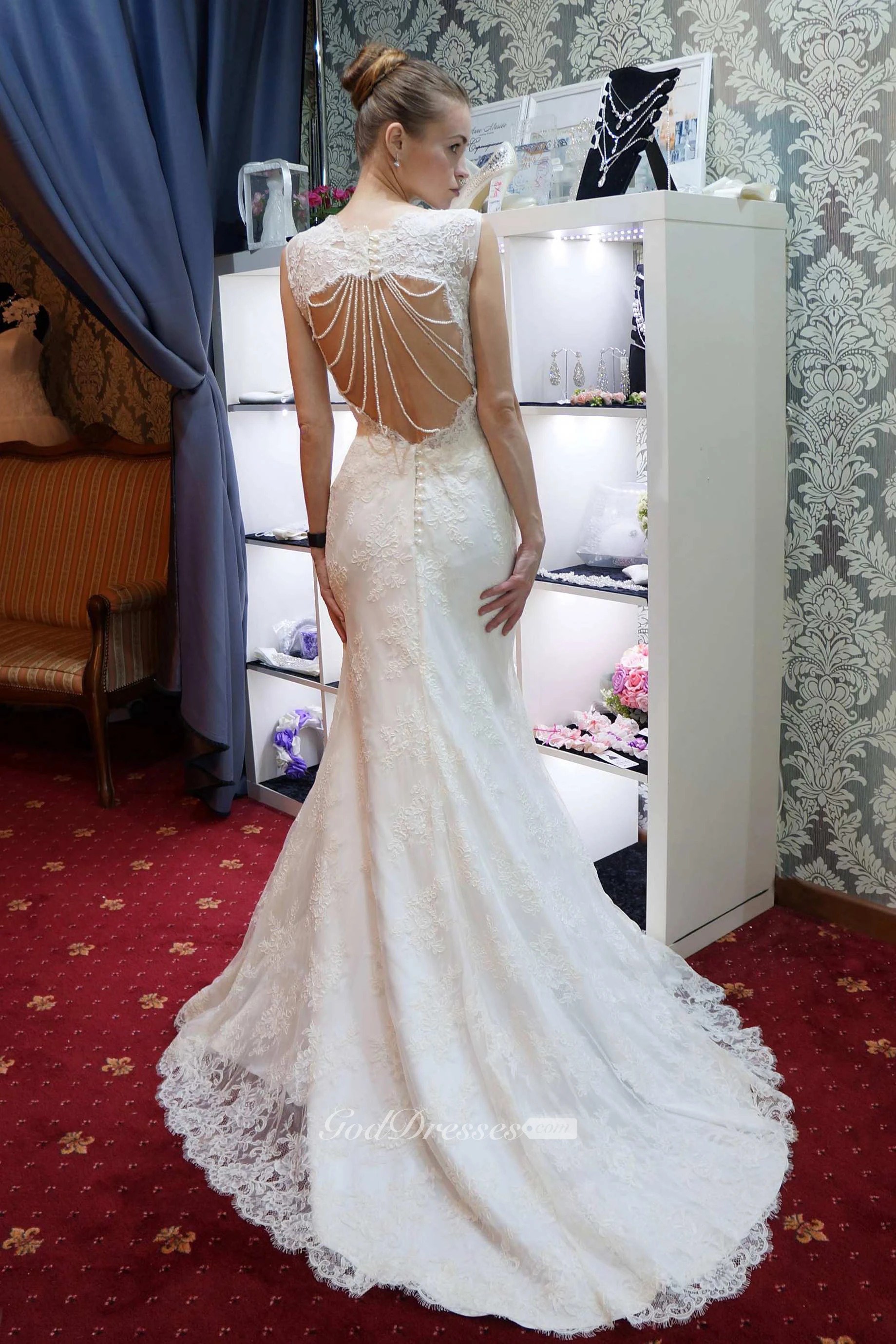 Sleeveless Lace A-Line Wedding Dress With Beaded Keyhole Back