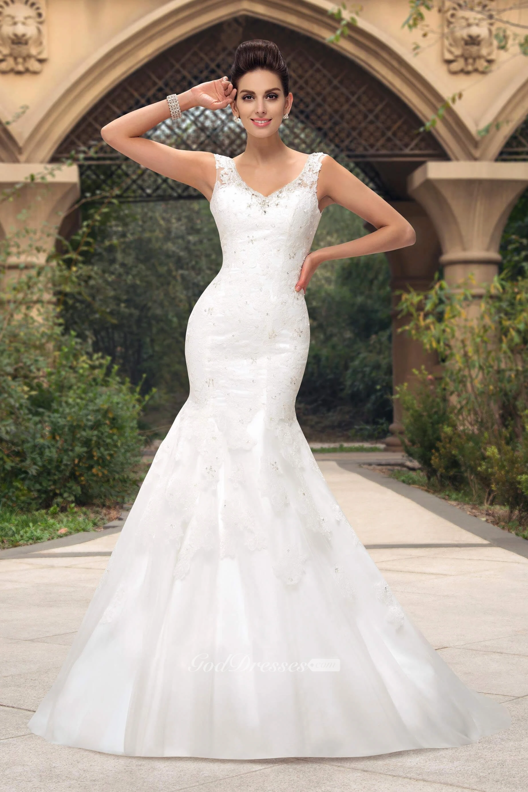 Sleeveless Mermaid Open Back V-neck Lace Appliqued Bridal Gown