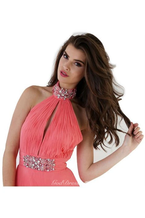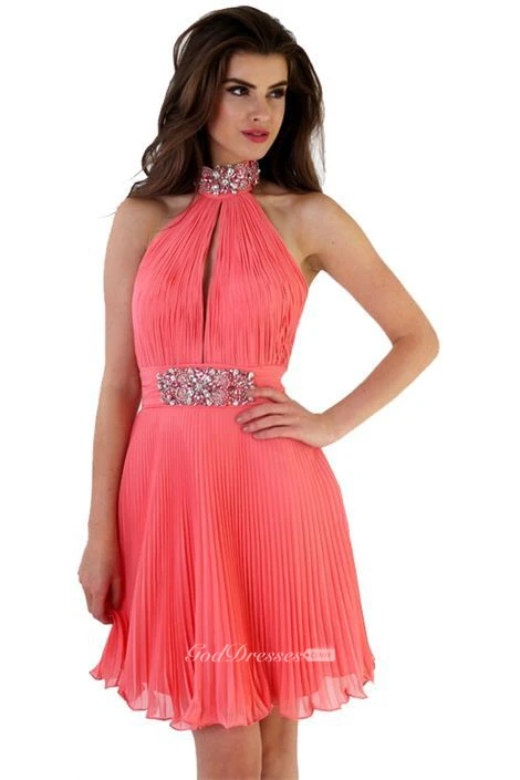 Sleeveless Pleated High-Neck Mini Chiffon Prom Dress With Beading
