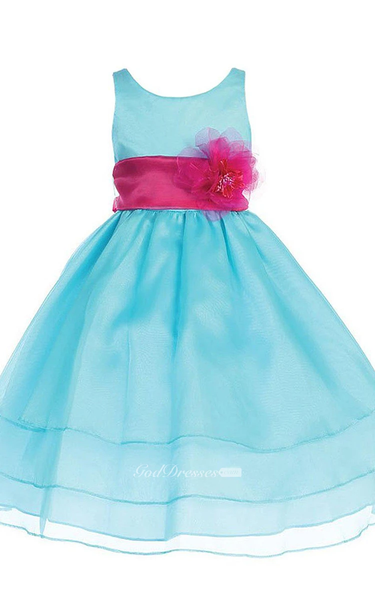 Sleeveless Scoop-neck A-line Dress With Flower and Pleats