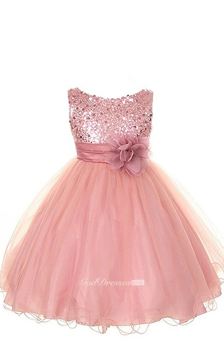 Sleeveless Scoop-neck A-line Sequined Dress With Flower