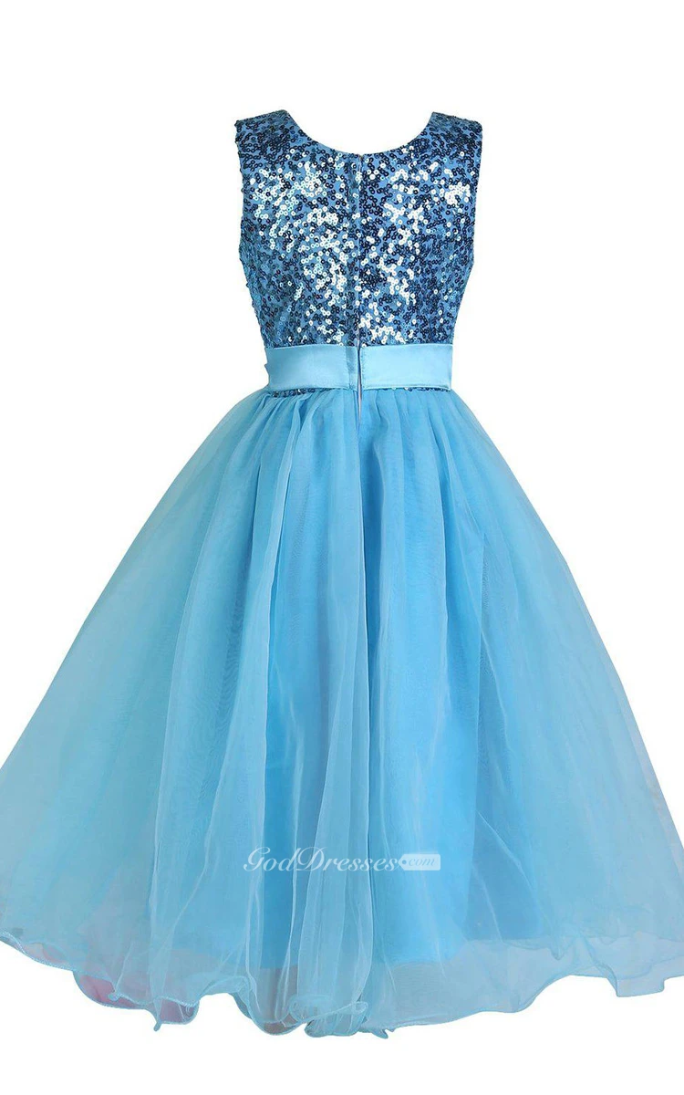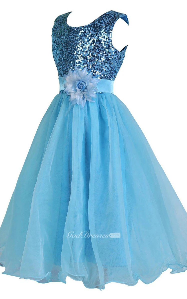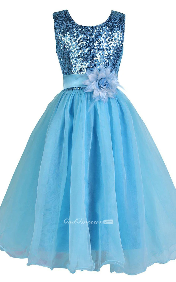Sleeveless Scoop-neck Sequined Dress With Flower and Pleats