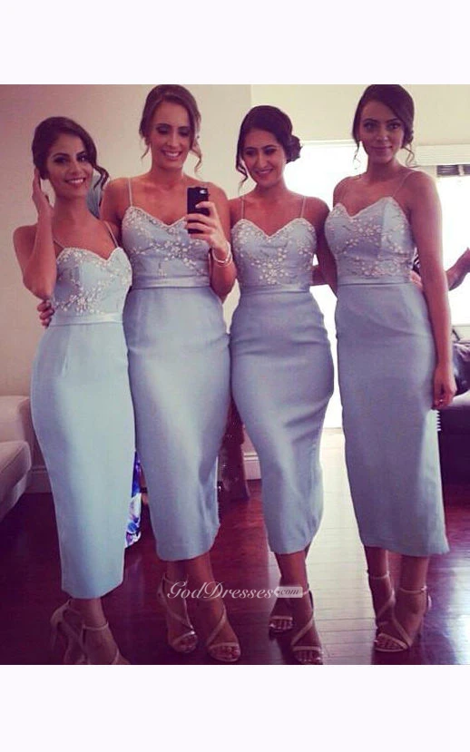 Sleeveless Tea-length Sheath Taffeta Dress with Spaghetti Straps
