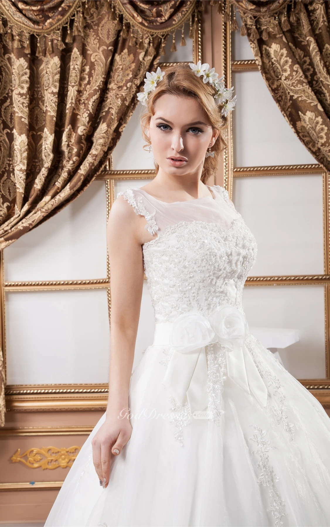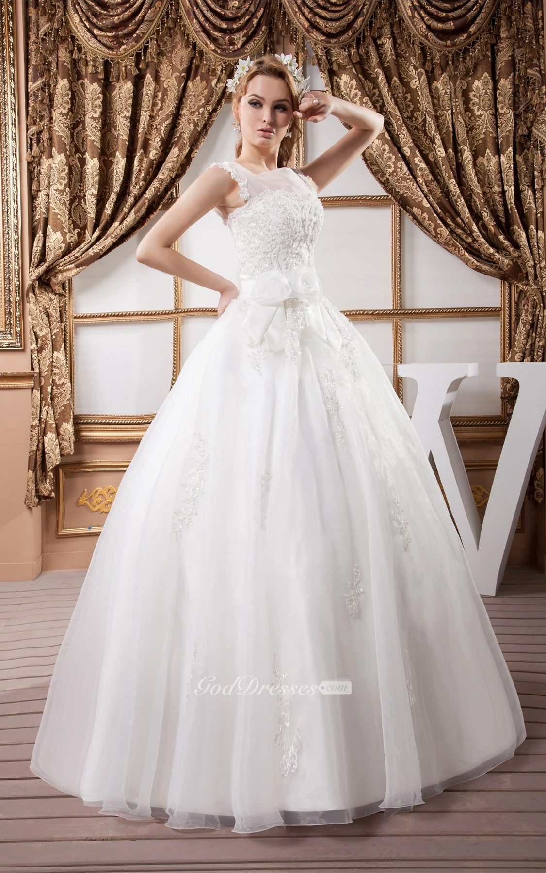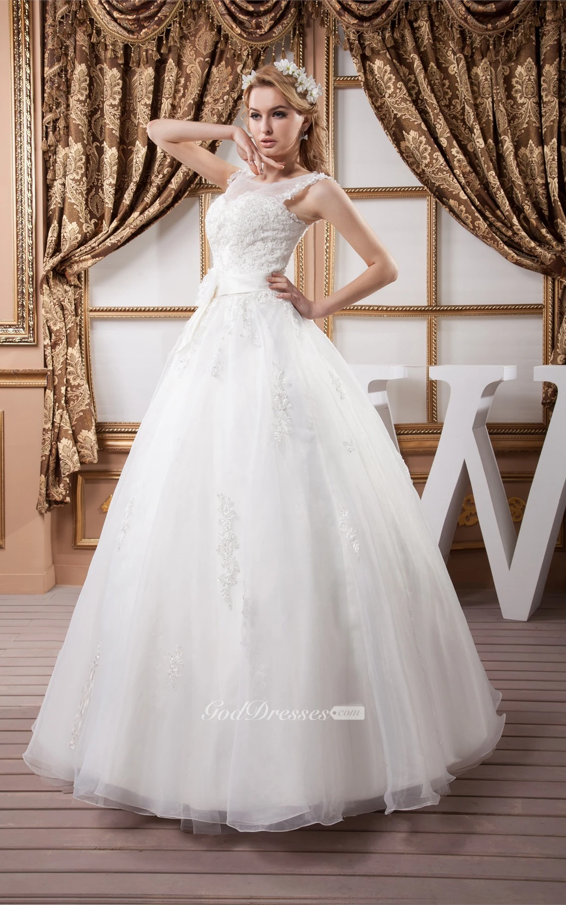 Sleeveless Tulle Illusion Neckline and Ball-Gown With Appliques