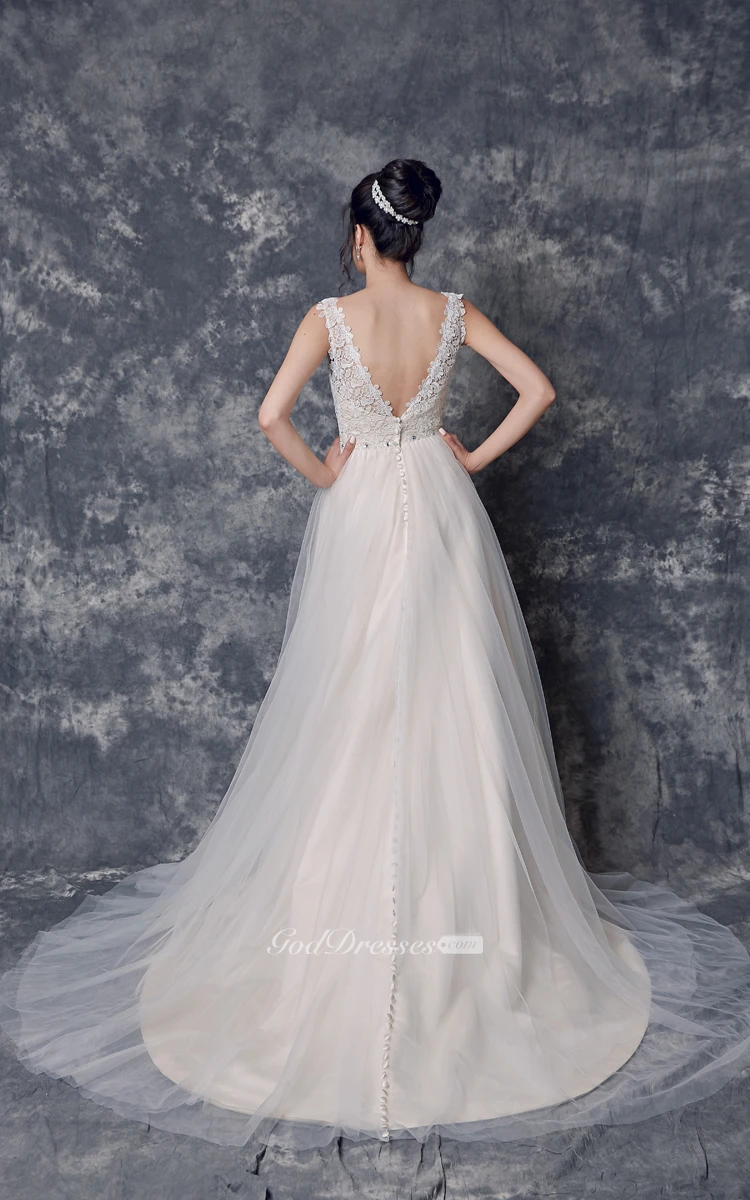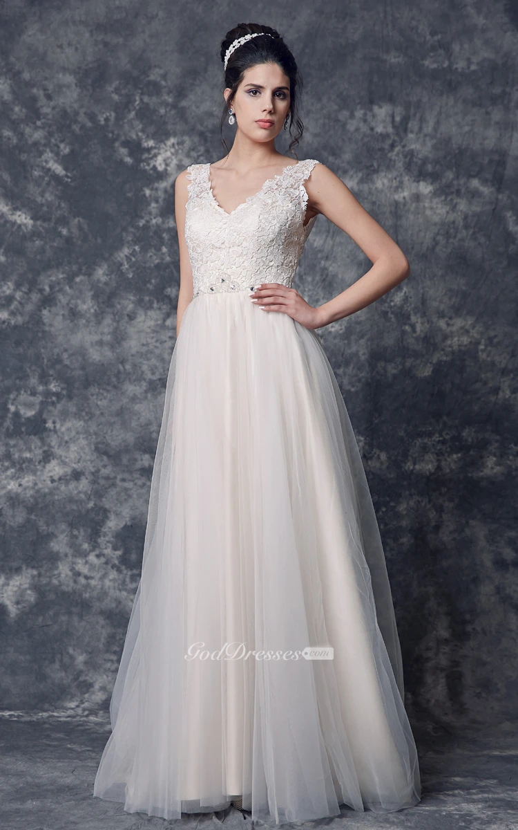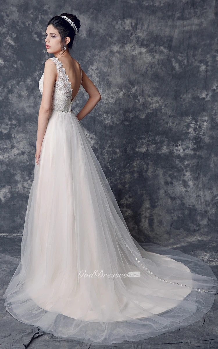 Sleeveless V-neck A-line Tulle Gown With Beaded Belt