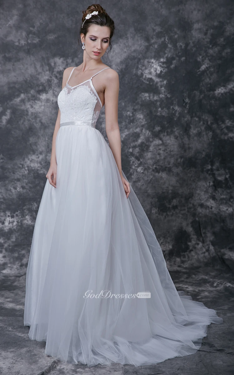 This elegant wedding dress will make you look like a prima ballerina. The bodice is simple, with thin straps, a low back, and lace applique over sheer tulle. The glistening tulle skirt is floor-length, and falls into a brush train. A thin ribbon at the natural waist ties the dress together, and adds one more detail to the elegant ballerina style of the dress.