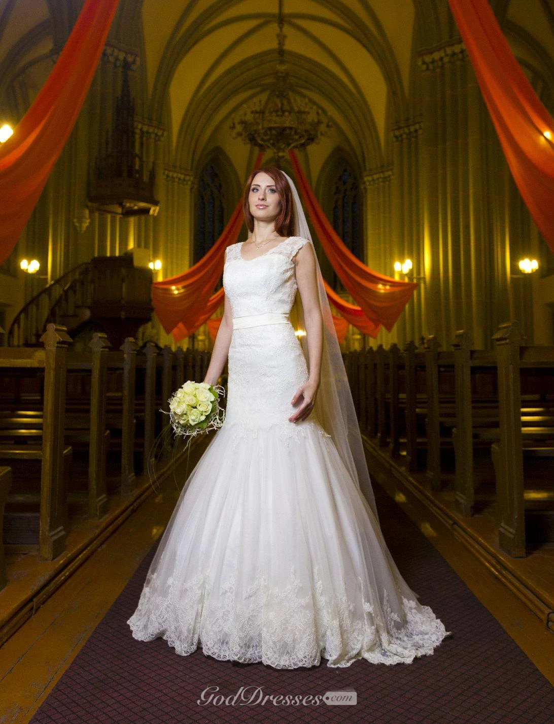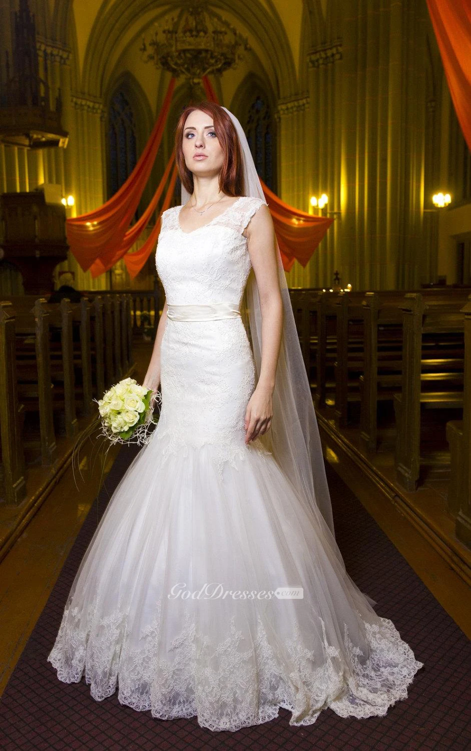 Sleeveless V-Neck Mermaid Lace Gown With Low-V Back and Satin Sash