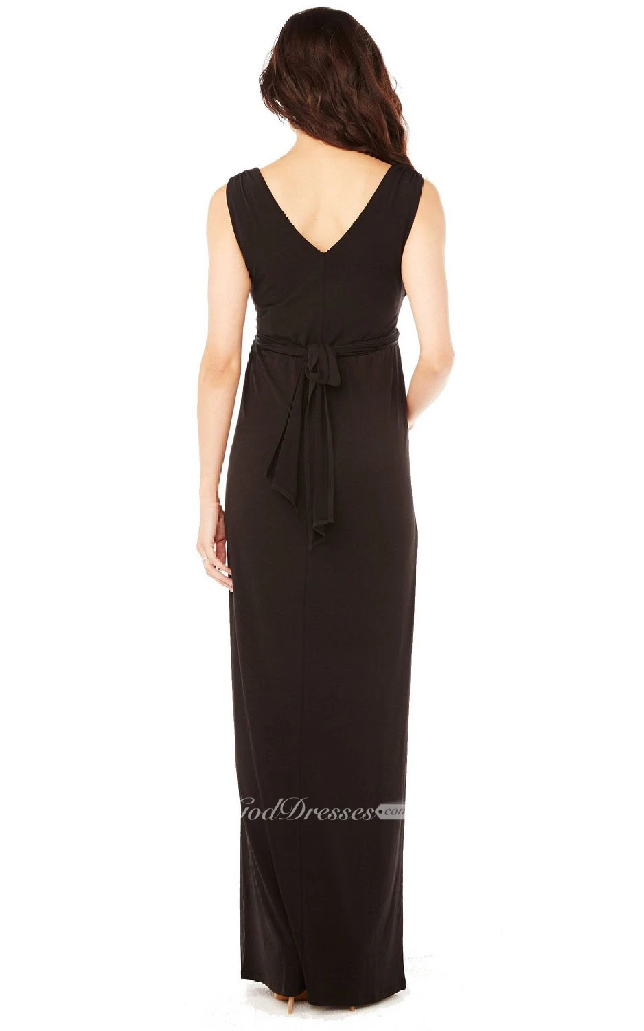 Sleeveless V-neck Ruched Bodice Long Satin Dress