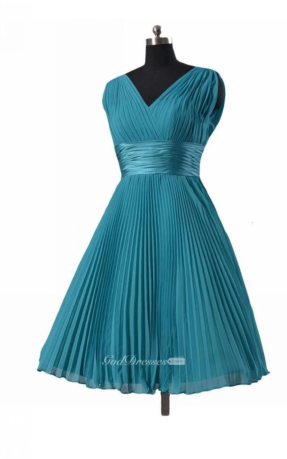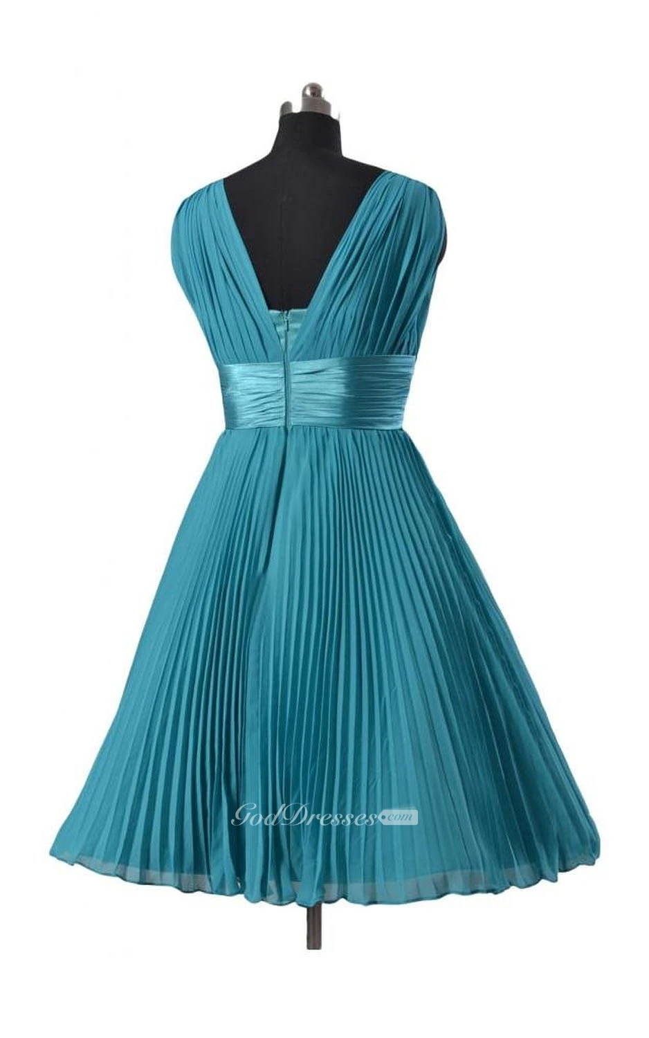 Sleeveless V-neck Ruched Sash Knee-length Pleated Chiffon Dress