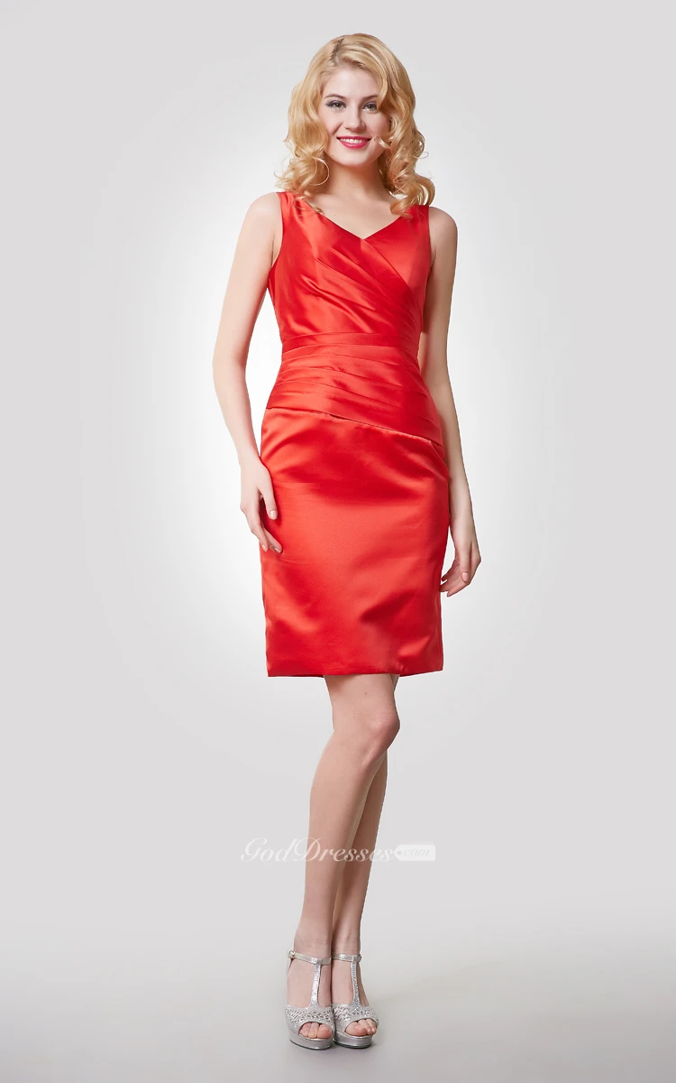 Sleeveless V-Neck Short Satin Dress With Ruching and Asymmetrical Waistline