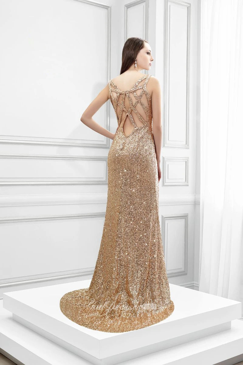 Sleeveless V-Neck Split-Front Sequin Prom Dress With Straps
