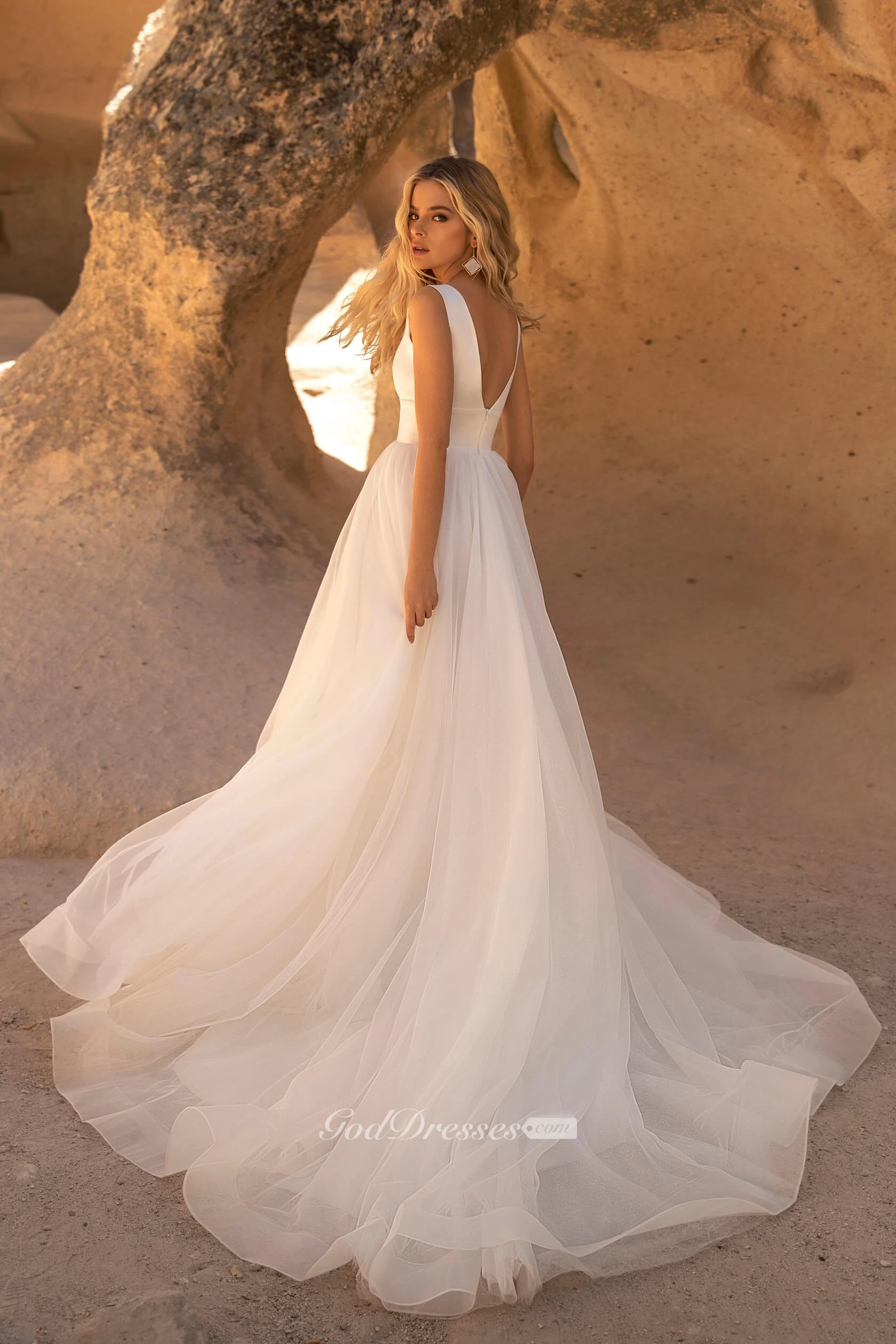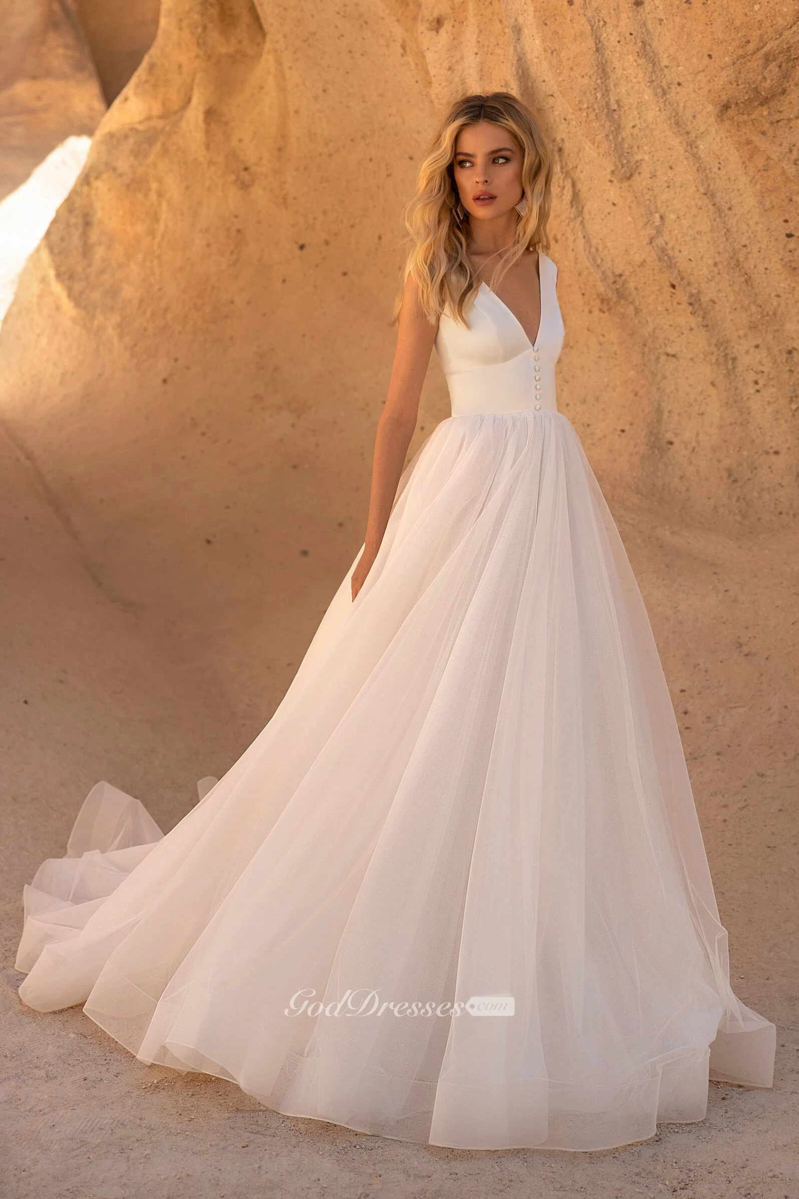 Sleeveless V-neck With Button Details And V-back Tulle A-line Wedding Dress