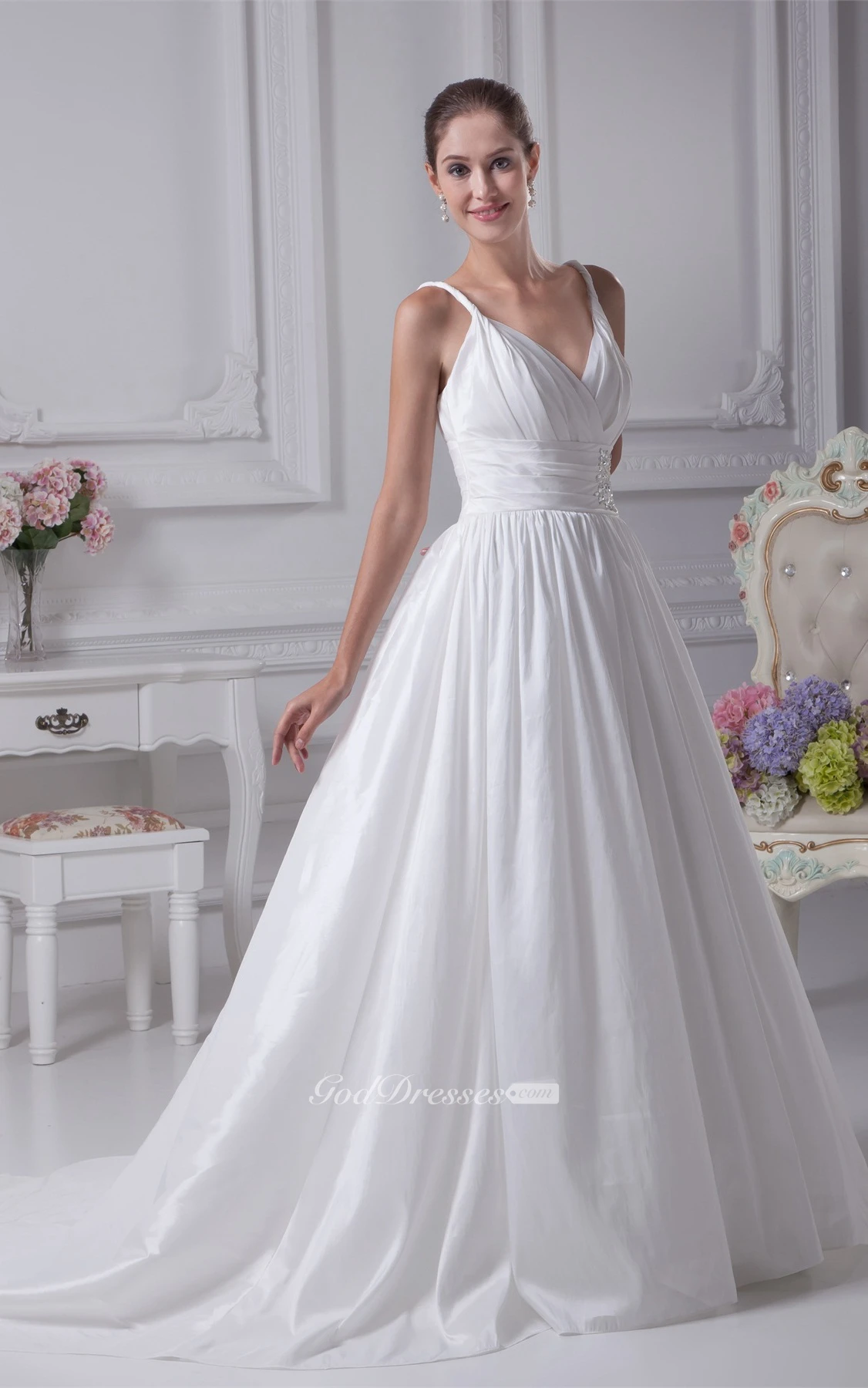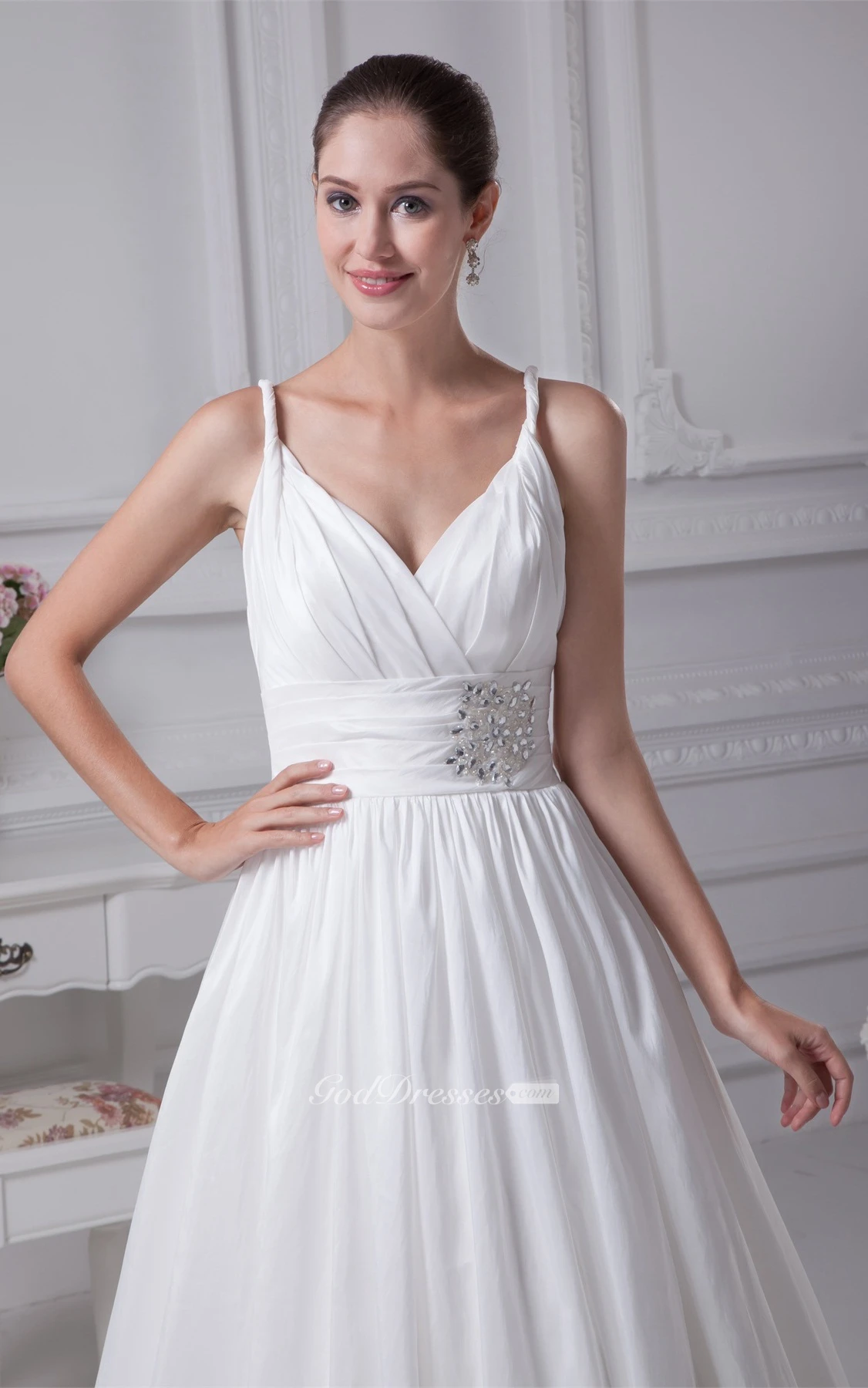 Spaghetti-Strap A-Line Plunged Pleats and Gown With Broach