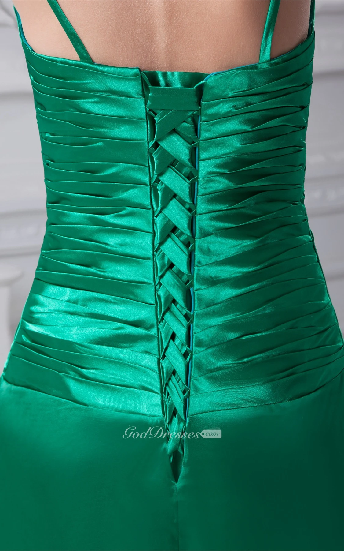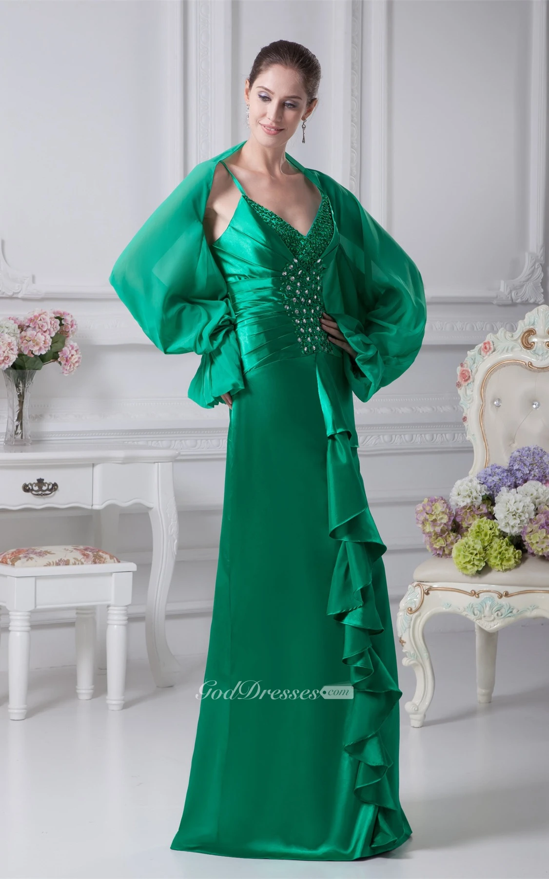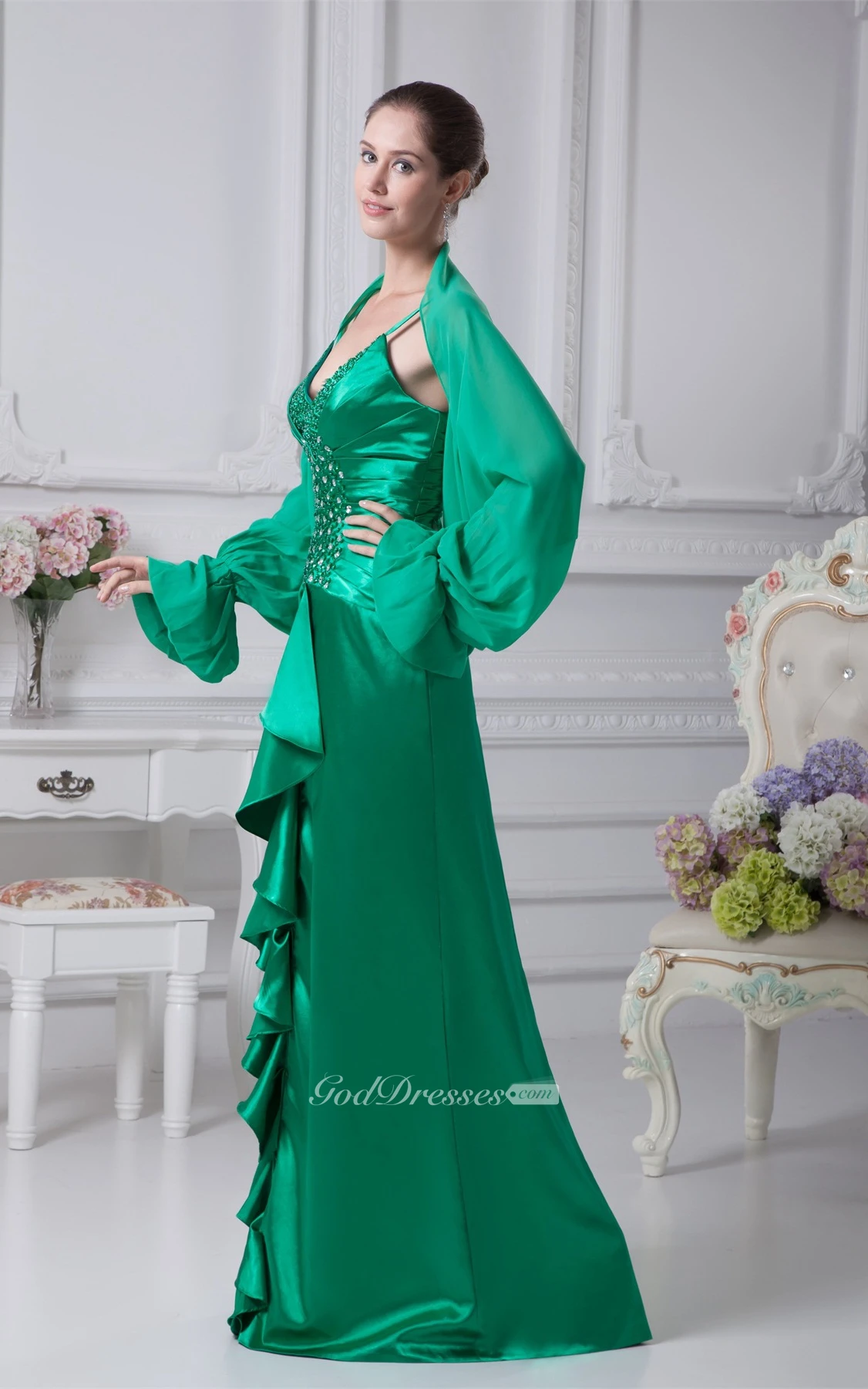 Spaghetti-Strap Satin Ruched Crystal Detailing and Gown With Bolero