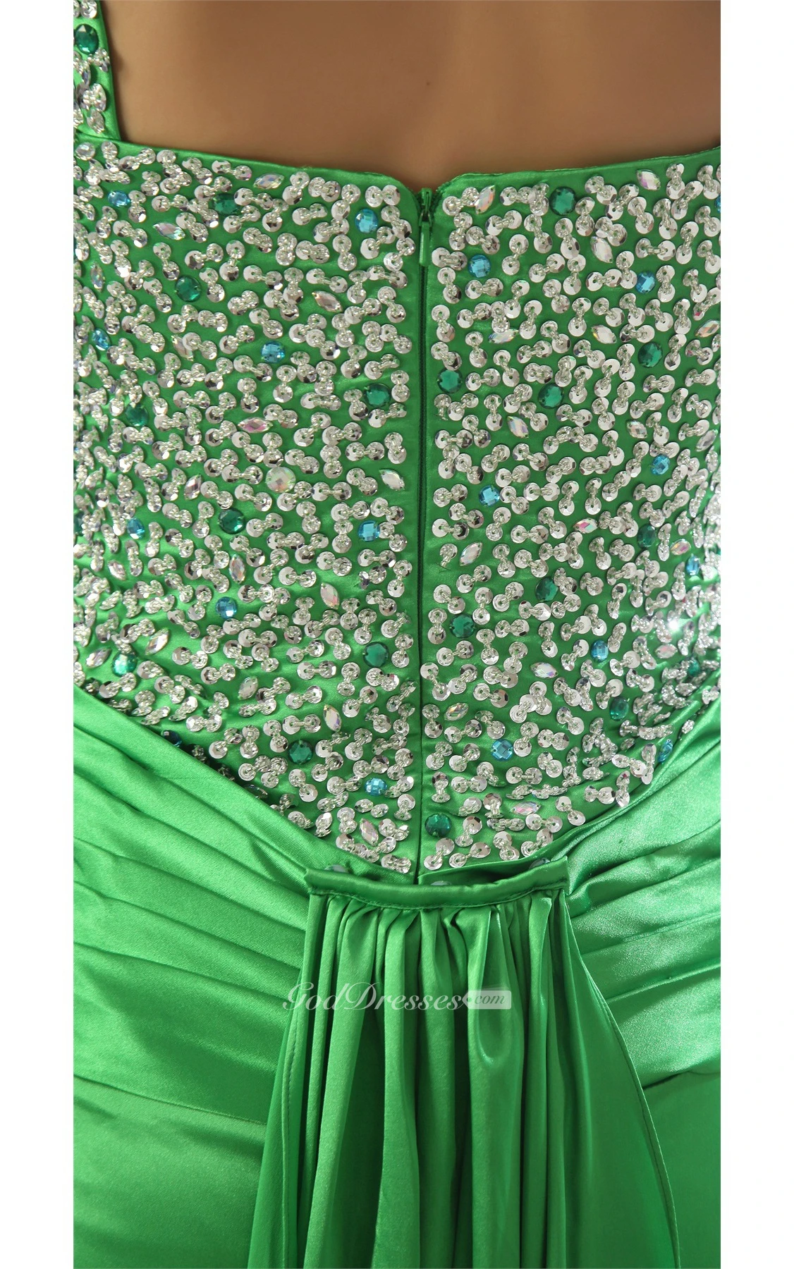 Spaghetti Straps Front Split Ruched Gown With Crystal Detailing and Sweep Train