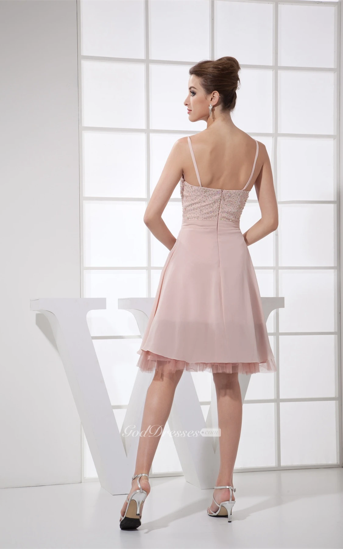 Spaghetti Straps Knee Length A-Line Chiffon Dress With Beadings and Zipper Back