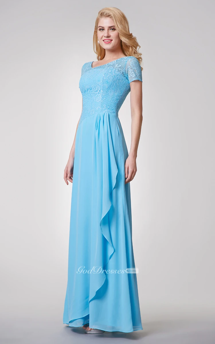 This stunning special illusion lace neckline long chiffon dress is the perfect choice for any mother of the bride to be. A beautiful a-line silhouette is accented by an illusion lace neckline and flattering short t-shirt style sleeves. An elegant full-length chiffon skirt features delicate pleats and an eye-catching side drape into a cascading ruffle. Perfect for any fashionable mother of the bride.