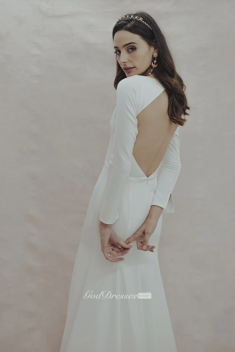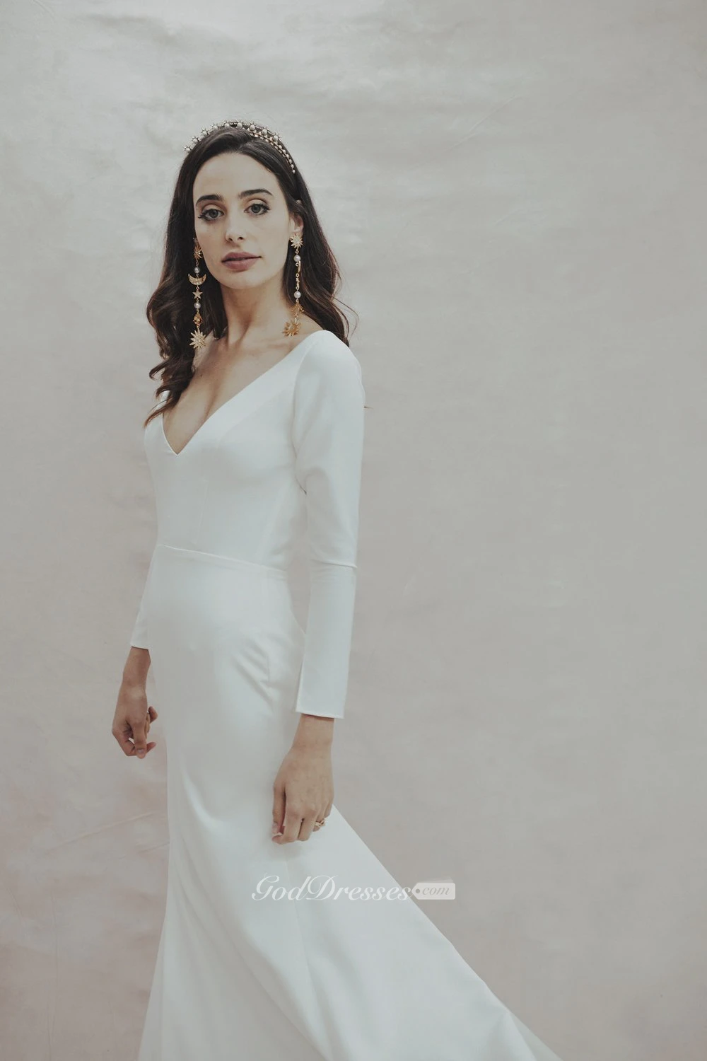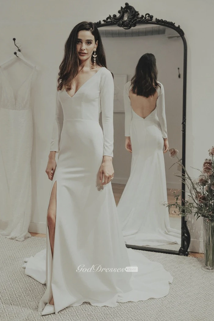 Split Front Satin Sexy Wedding Gown With Deep V-neck And Keyhole