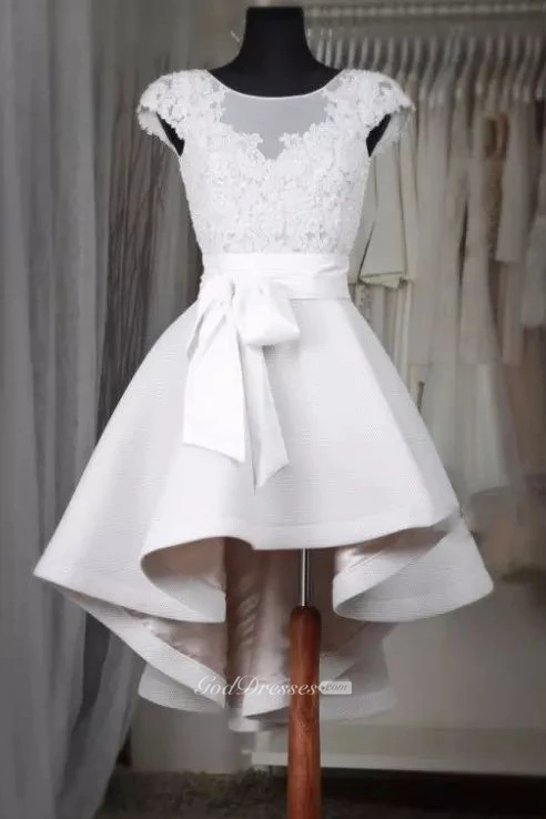 Square A-line High-low Short Sleeve Satin Wedding Dress with Zipper Back