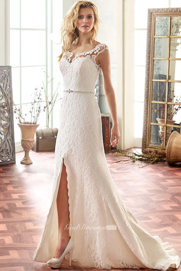 Square Long Split-Front Lace Wedding Dress With Sweep Train And Illusion