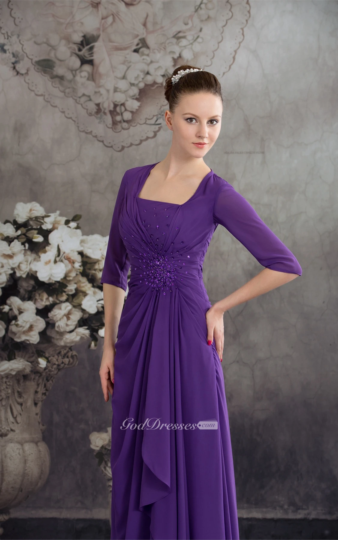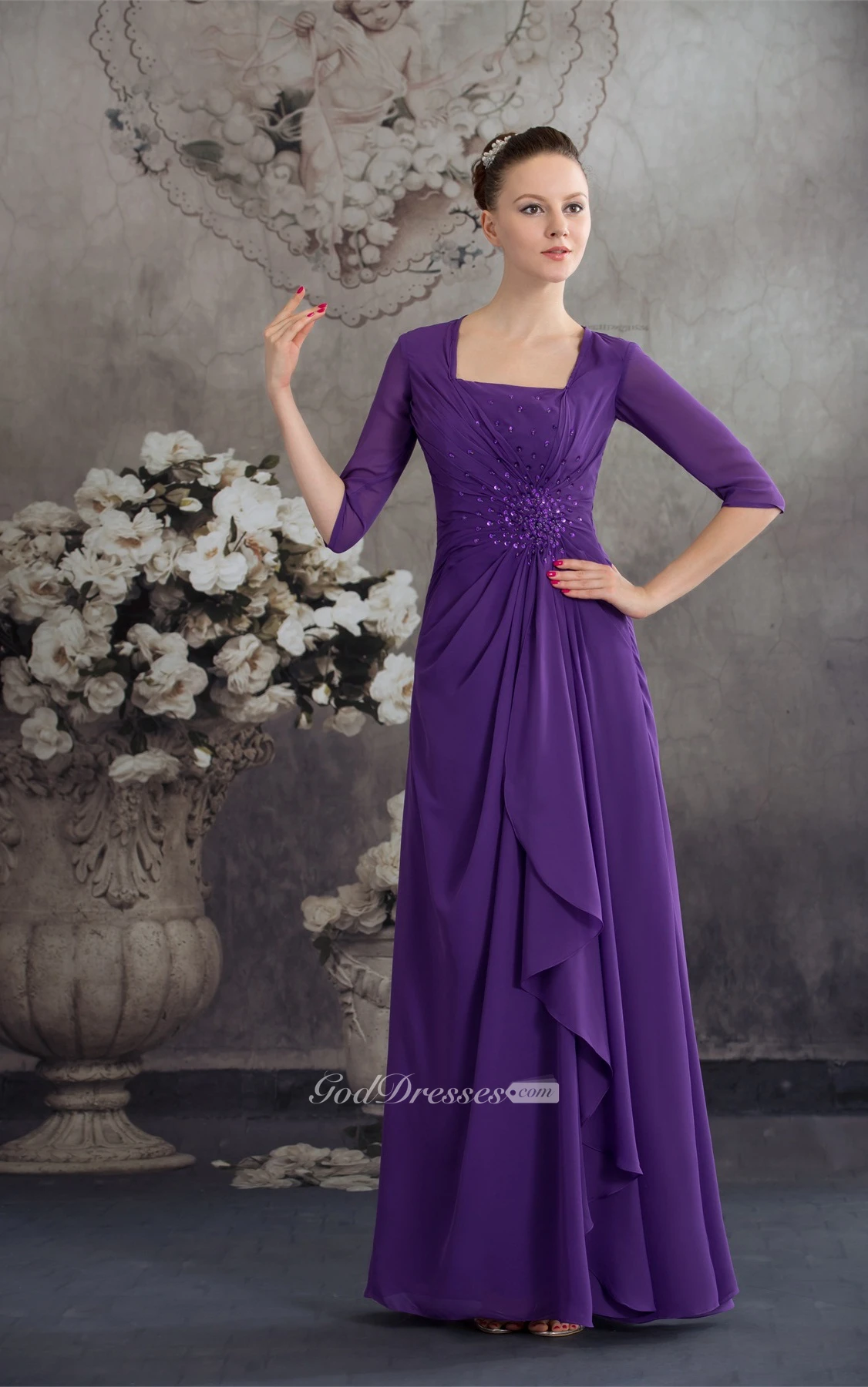 Square-Neck Chiffon Floor-Length Half-Sleeve Beading and Dress With Central Ruching
