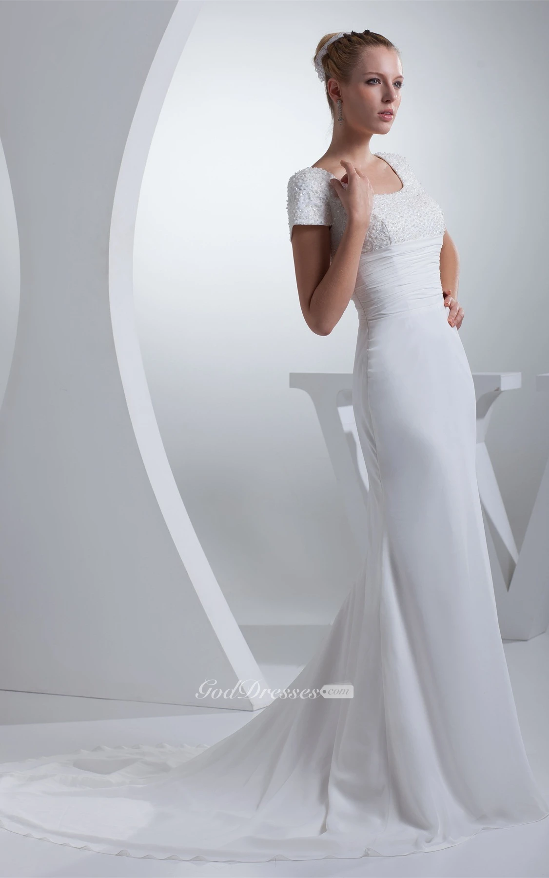 Square-Neck Sheath Mini-Sleeve Gemmed Top and Dress With Ruching