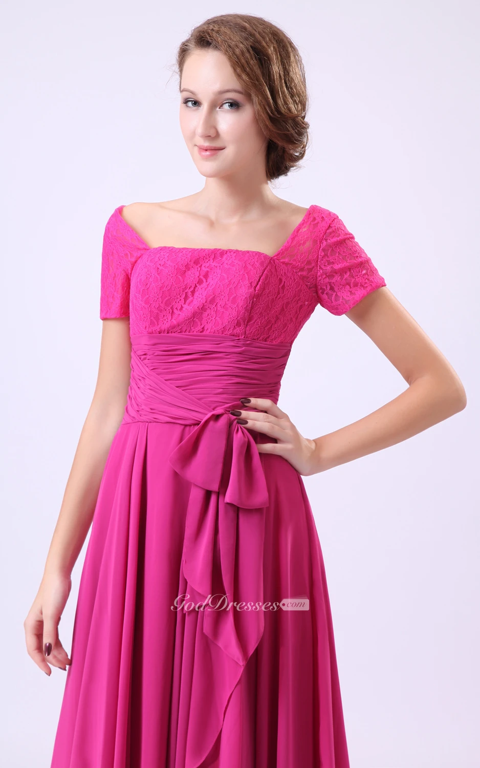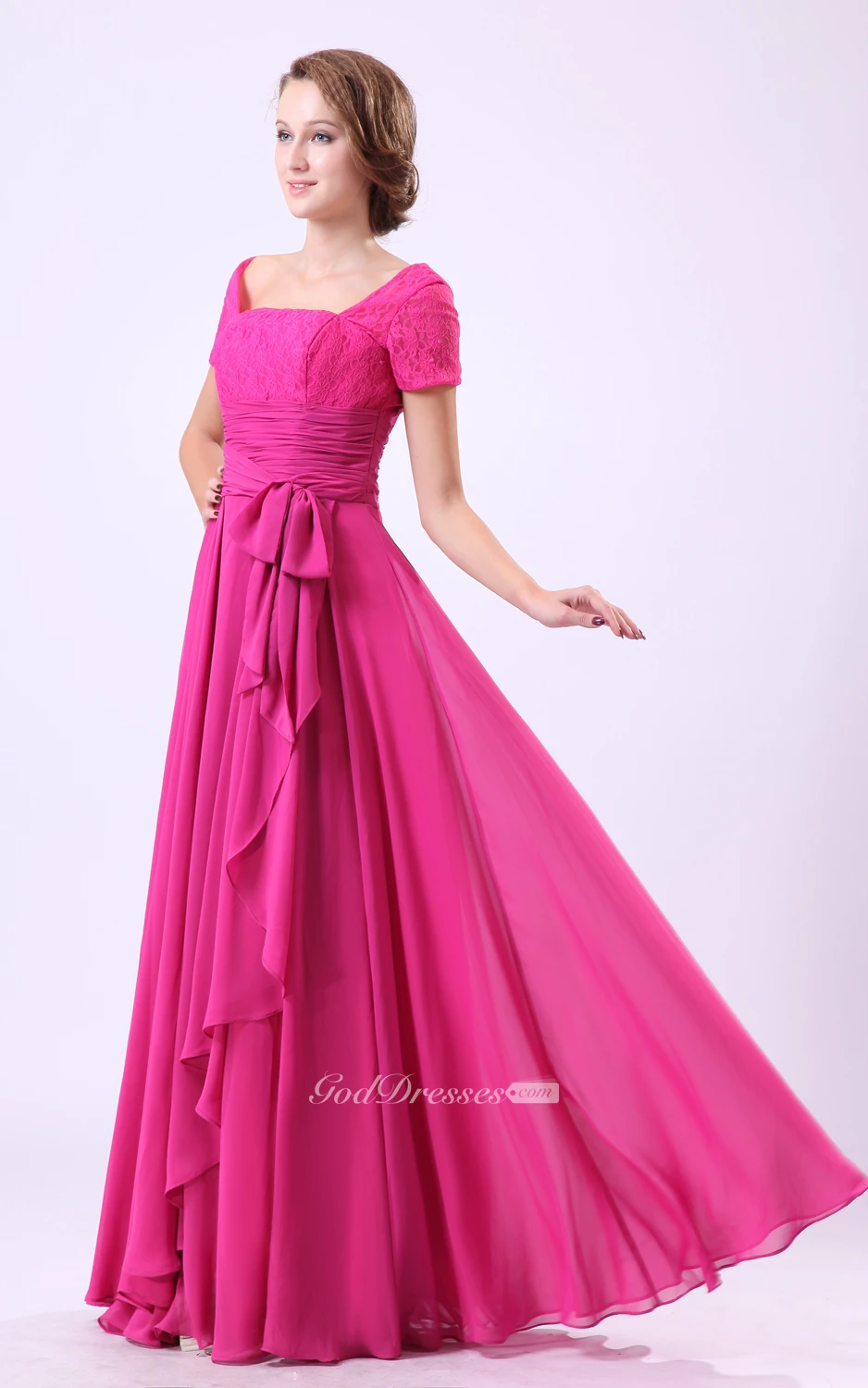 Square-Neck Short-Sleeve Chiffon Dress With Pleating and Laced Top