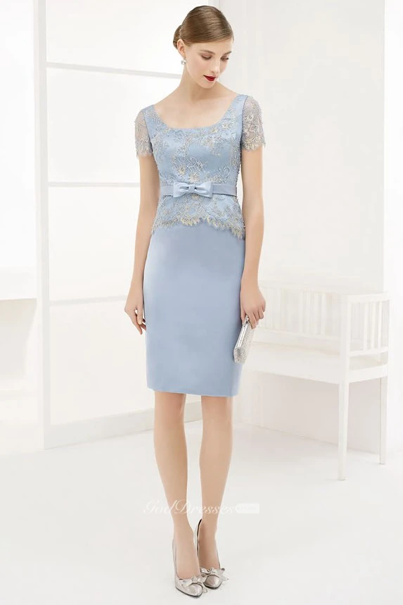 Square Neck Square Back Short Sleeve Knee Length Satin Prom Dress With Bow
