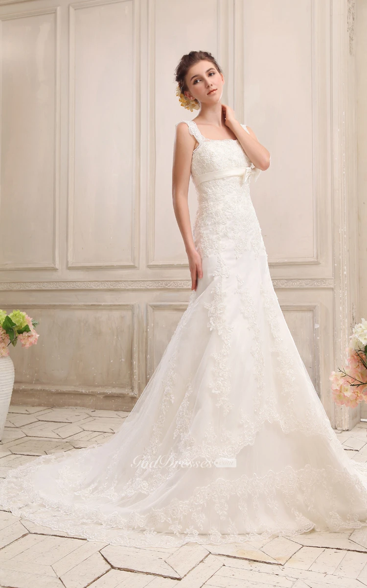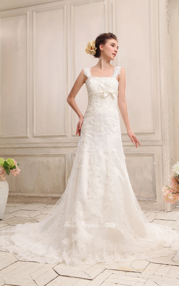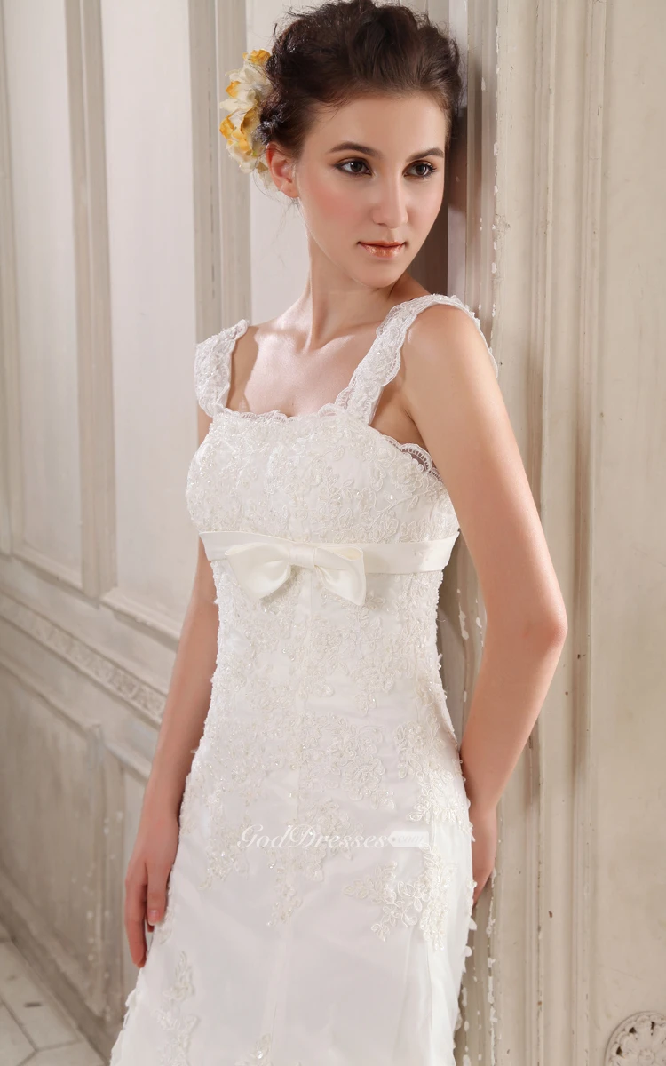 Square Neckline Straps Dress With Appliques and Bowed Sash