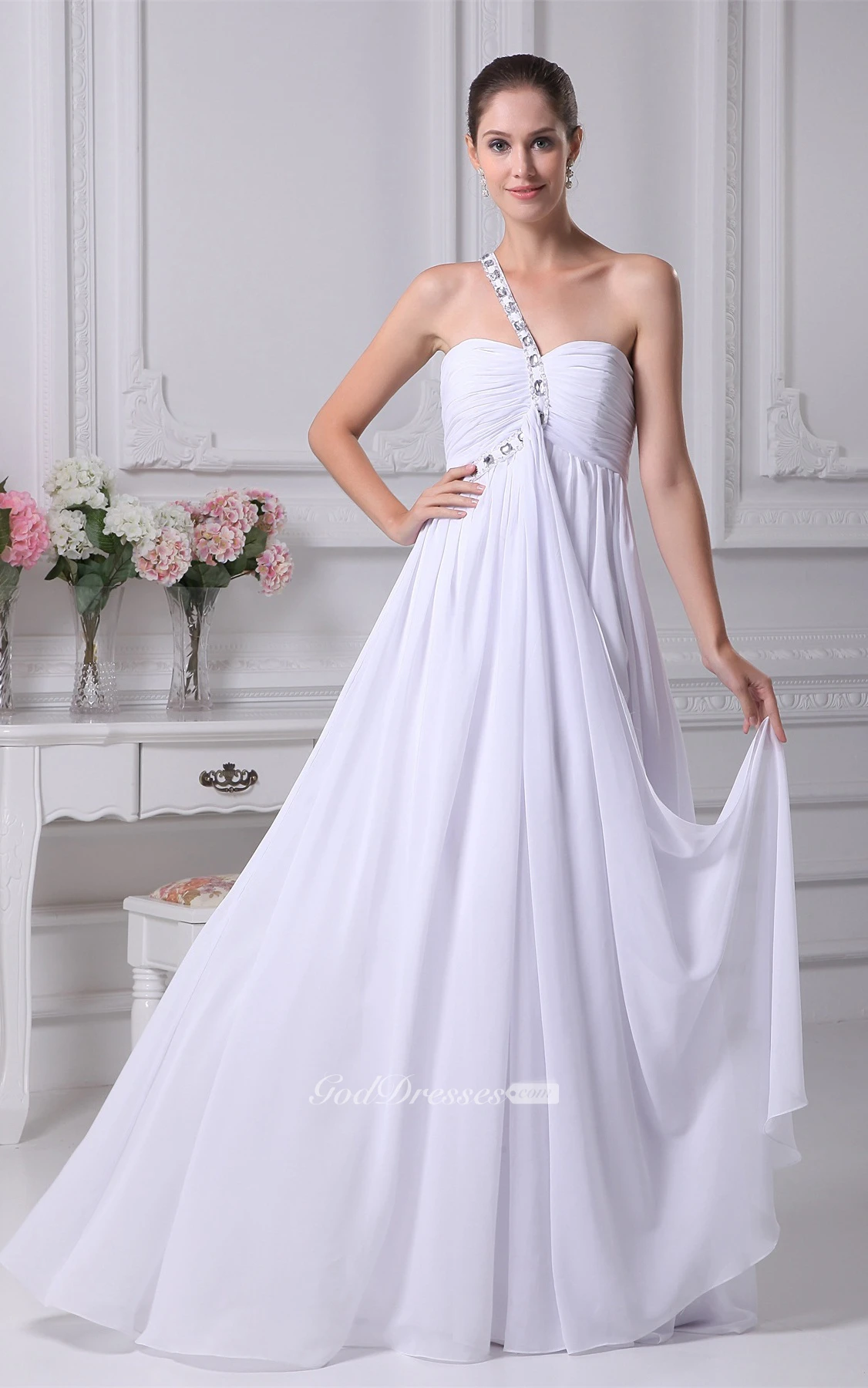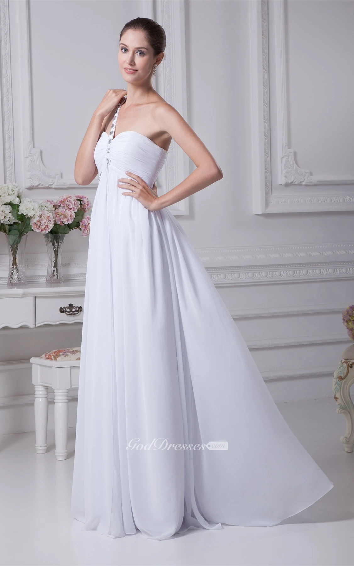 Strap One Shoulder Sweetheart Ruched Dress With Beadings and Zipper Back