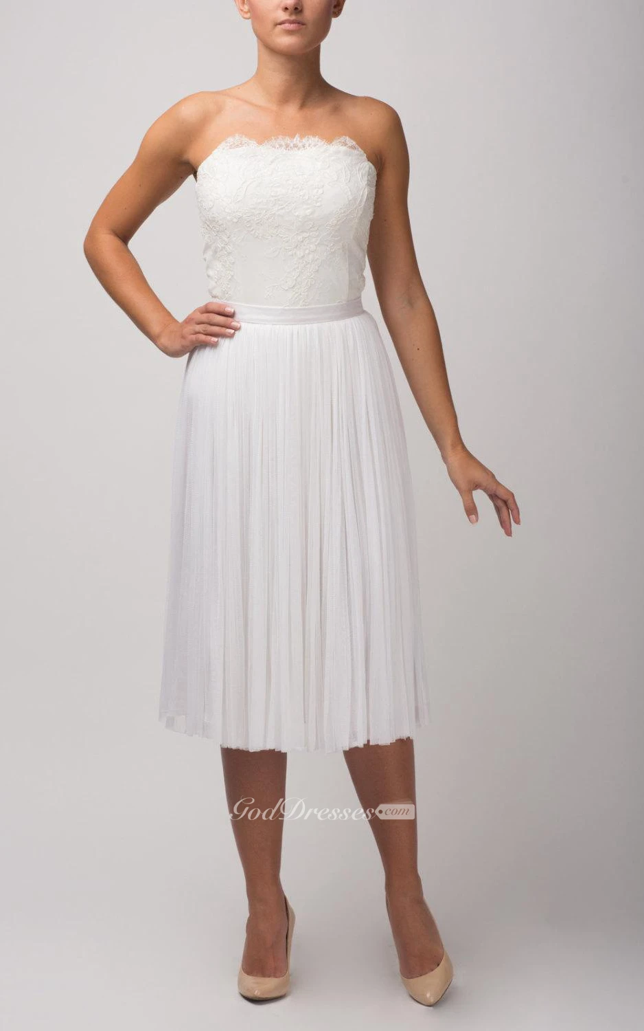 Strapless A-Line Knee Length Tulle Dress With Lace Bodice and Pleated Skirt