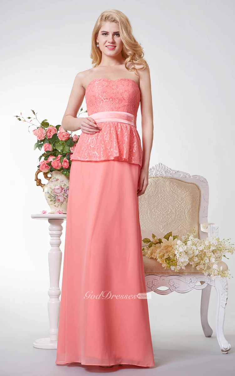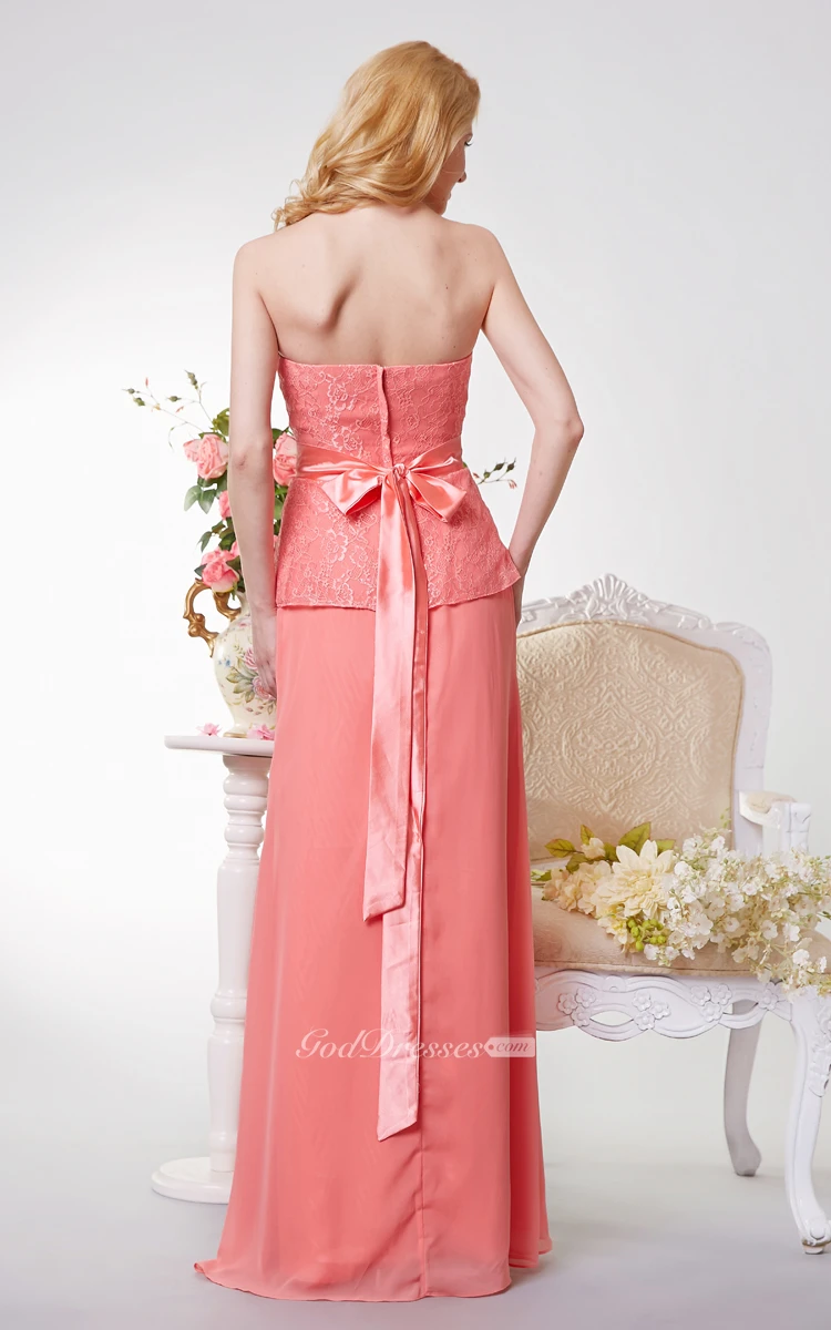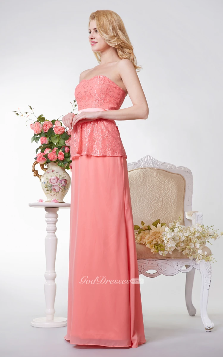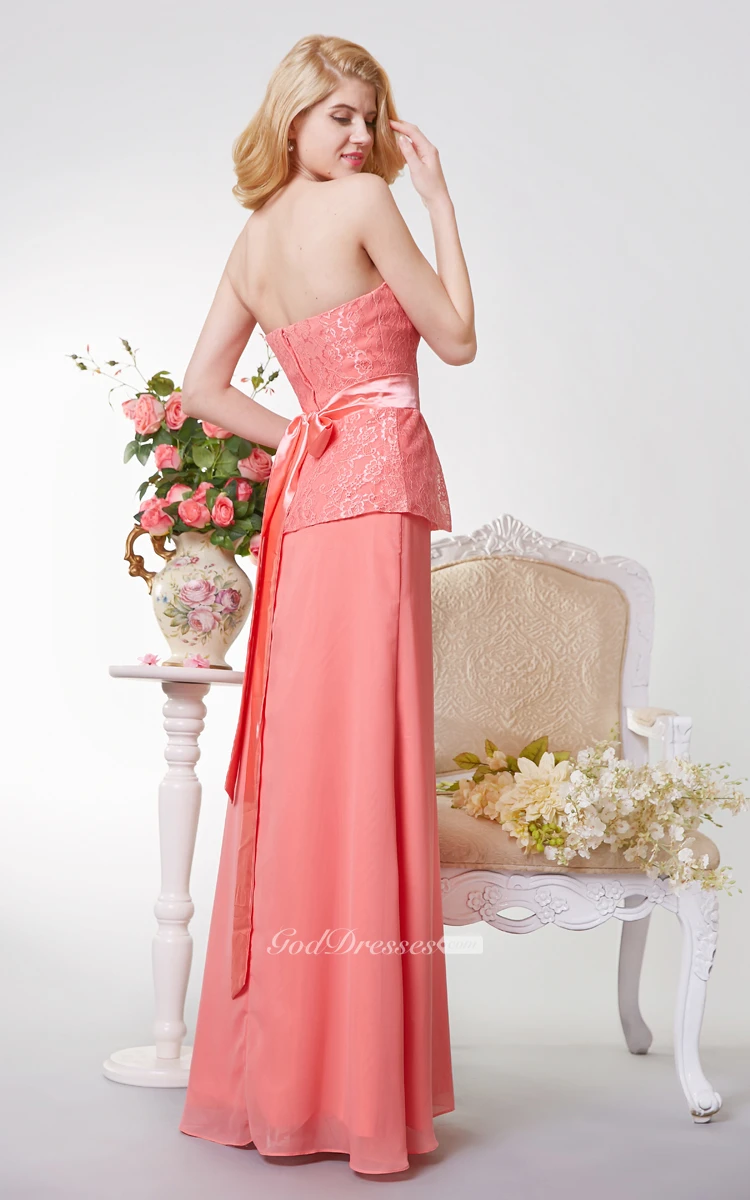 Strapless A-line Long Chiffon and Lace Dress With Sash