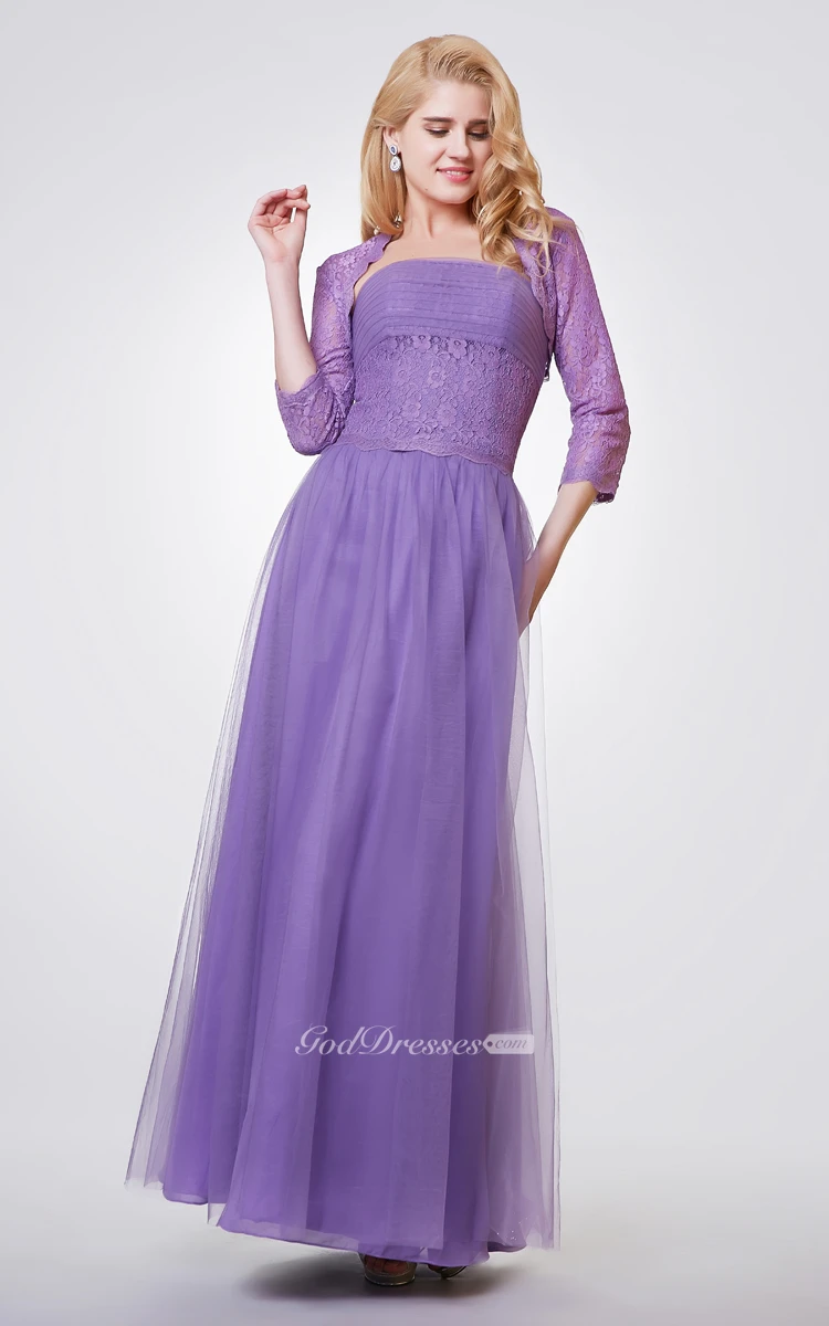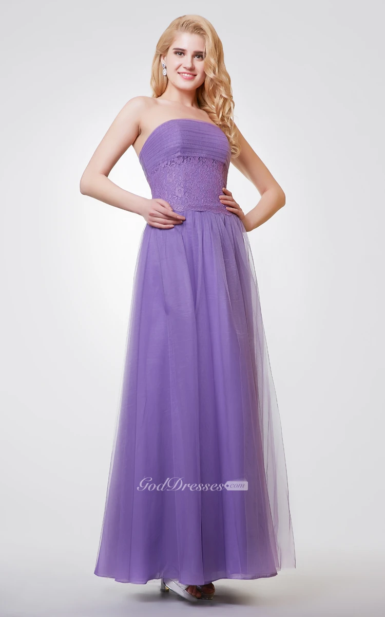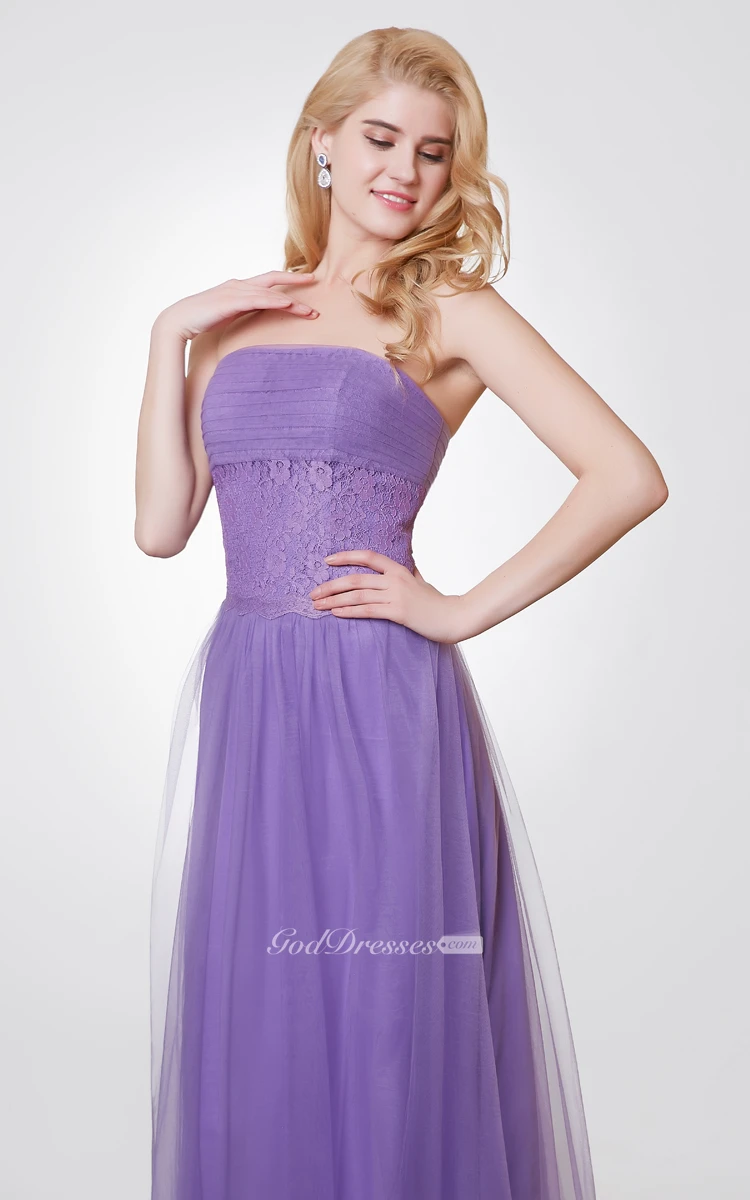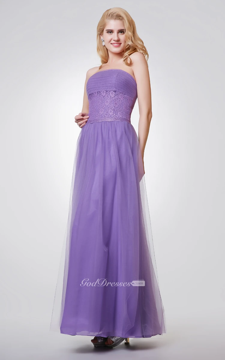 Strapless A-line Long Ruched Chiffon and Lace Dress