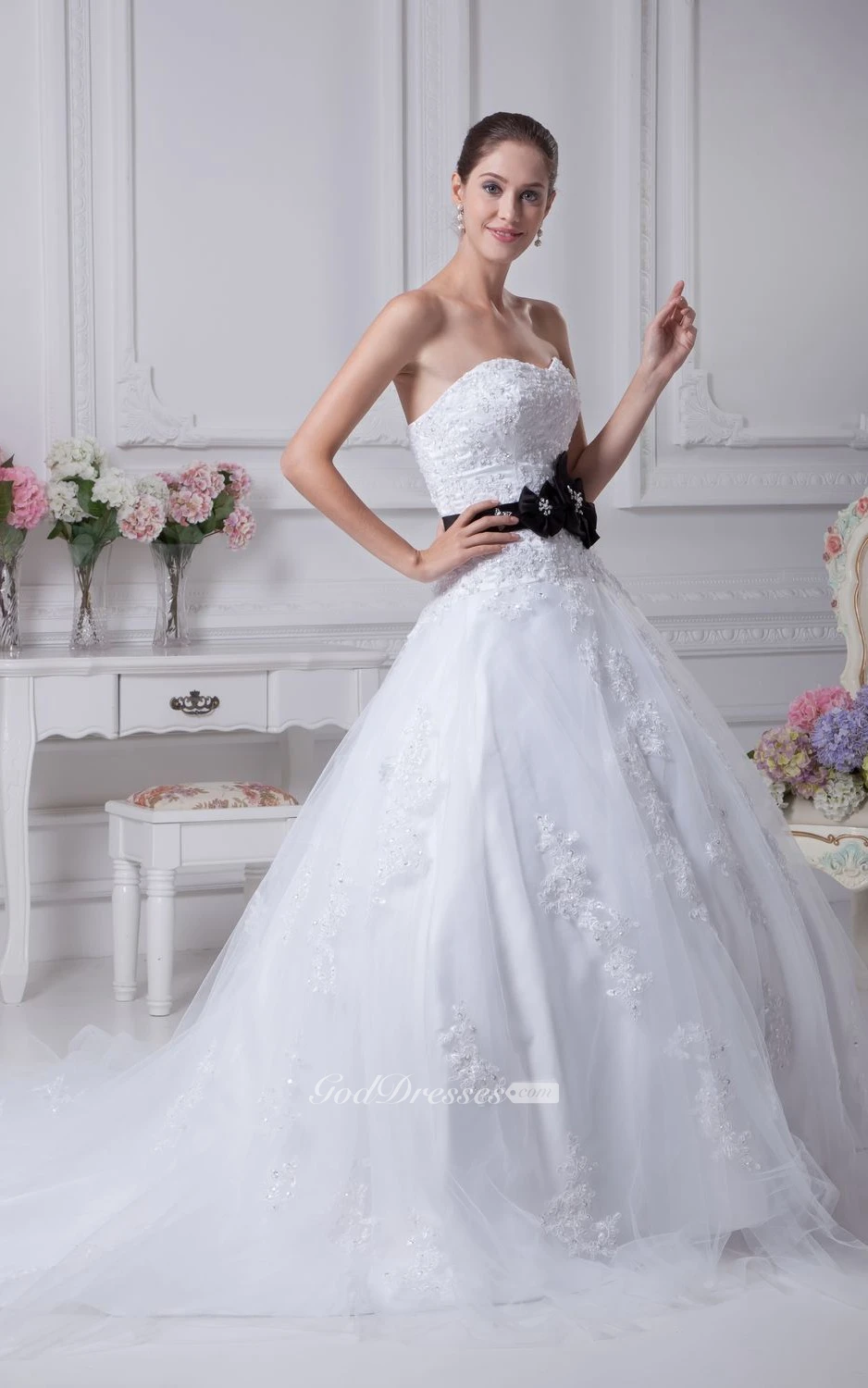 Strapless A-Line Tulle Ball Gown With Lace Appliques and Floral Waist