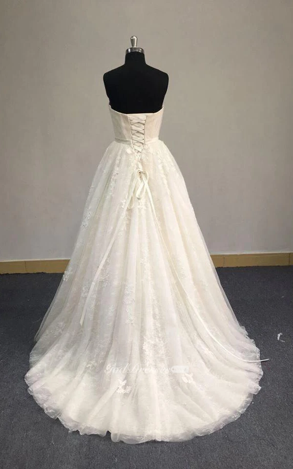 Strapless A-Line Tulle Dress With Lace Appliques and Lace-Up Back