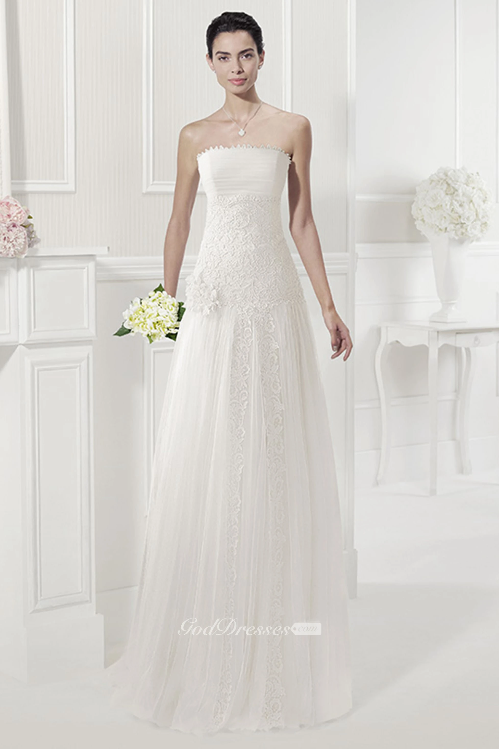 Strapless Drop Waist Tulle Gown With Appliques And Flower