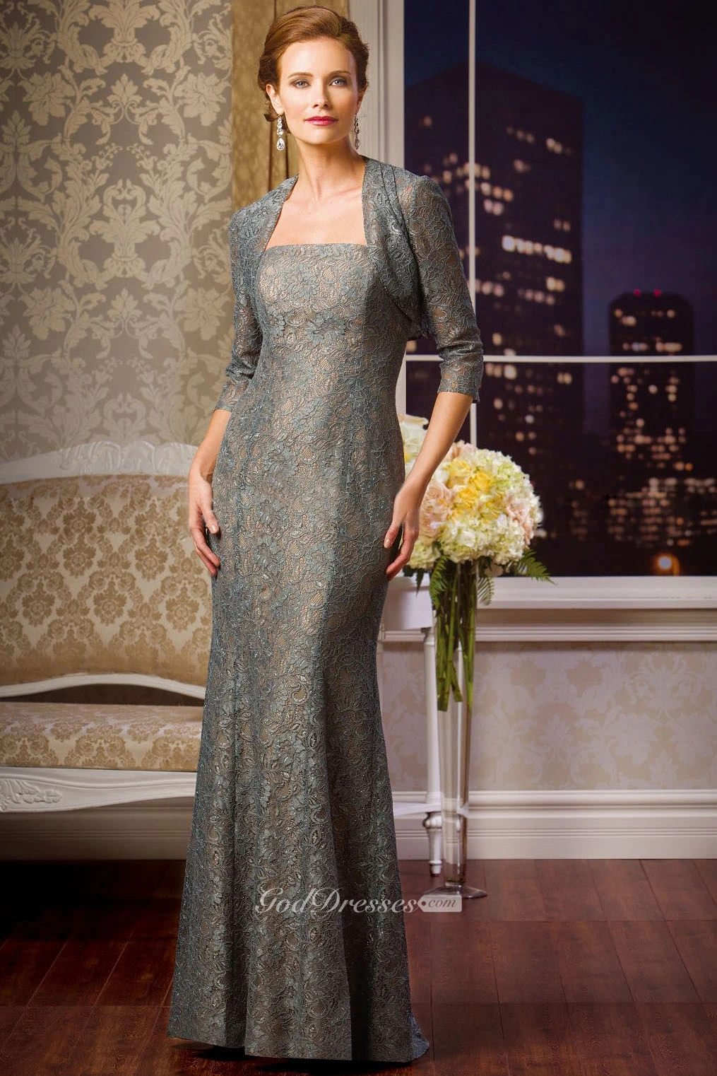Strapless Lace Gown With 3-4 Sleeved Jacket Style
