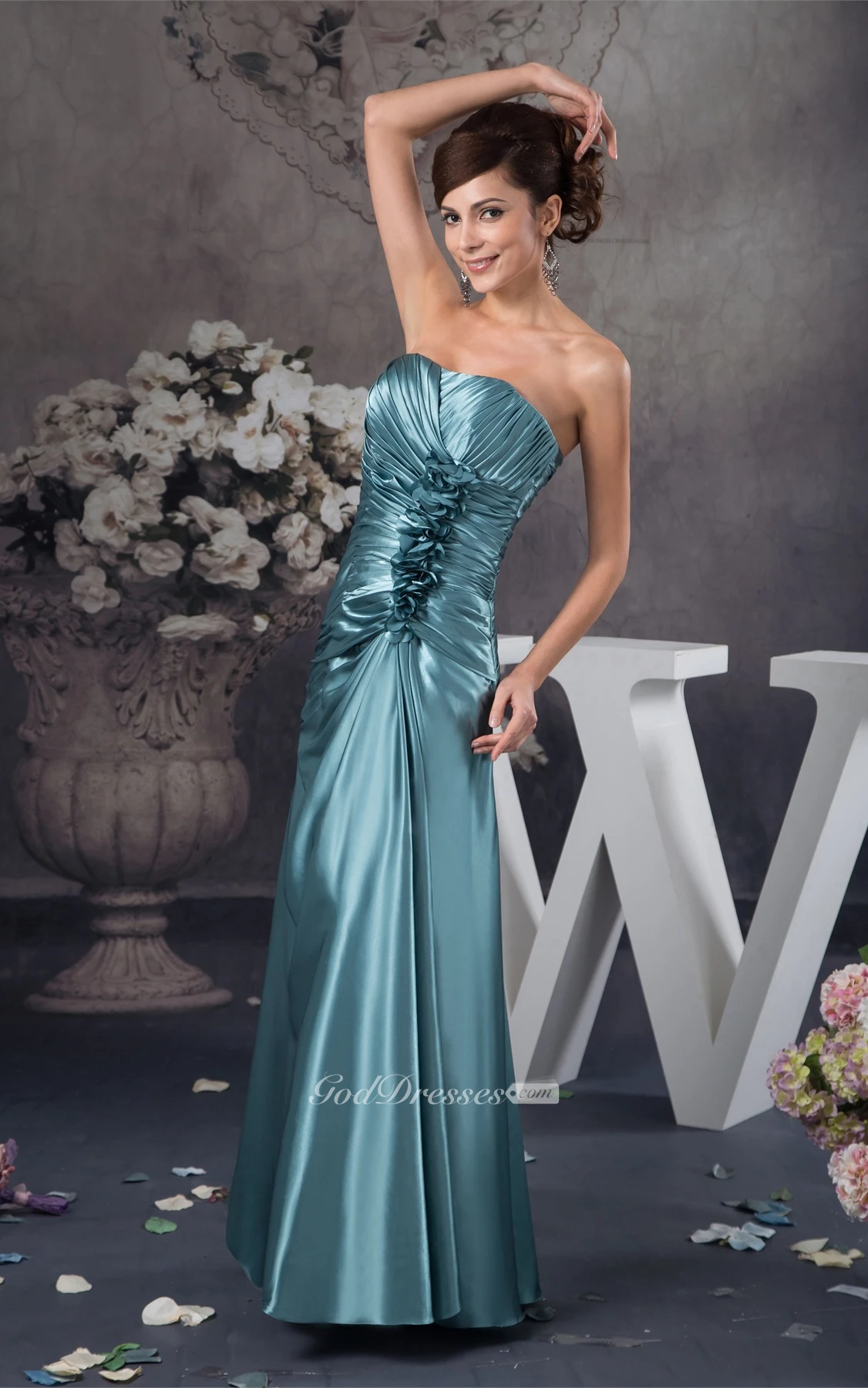 Strapless Maxi Criss-Cross Gown With Flower