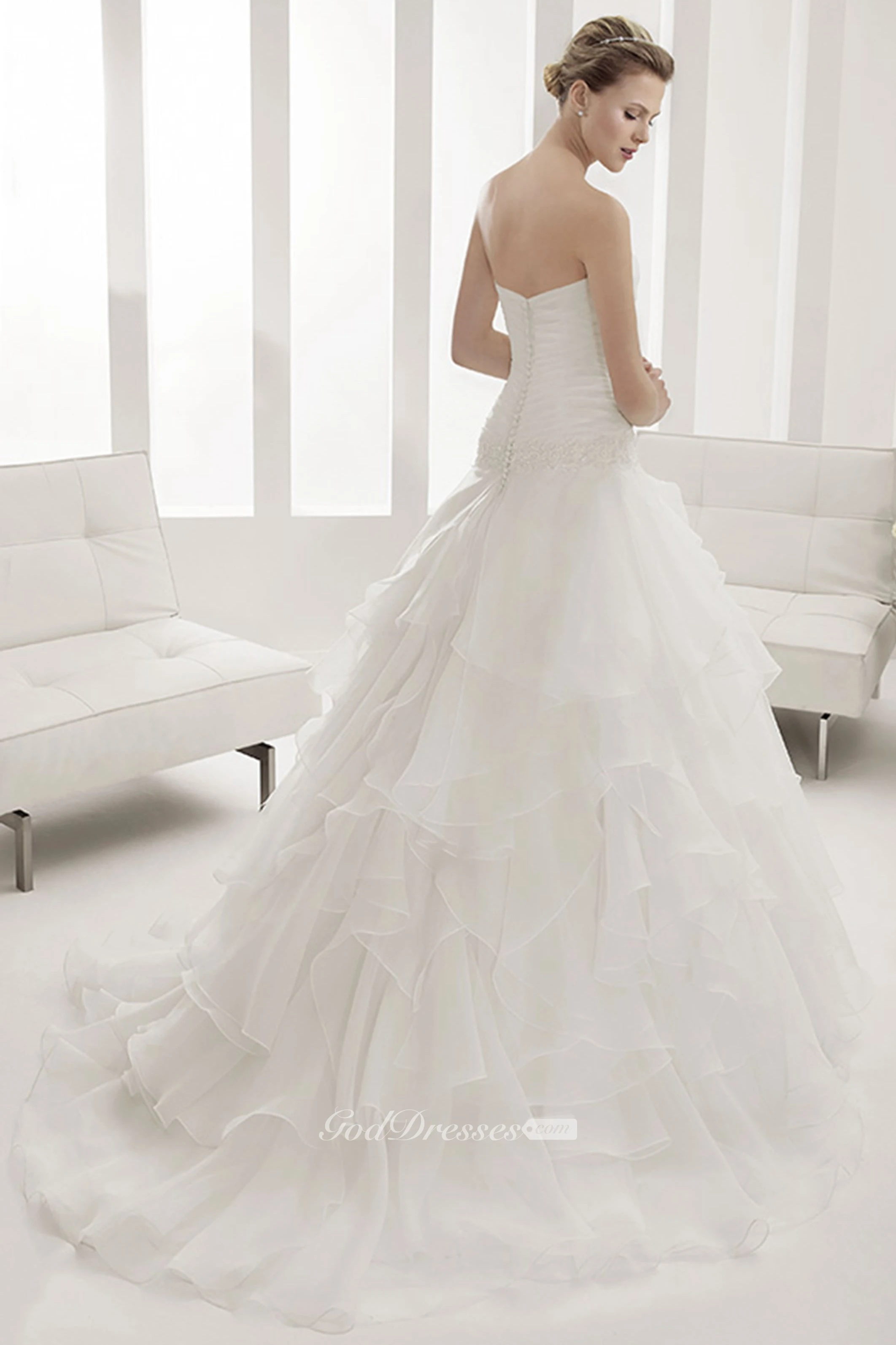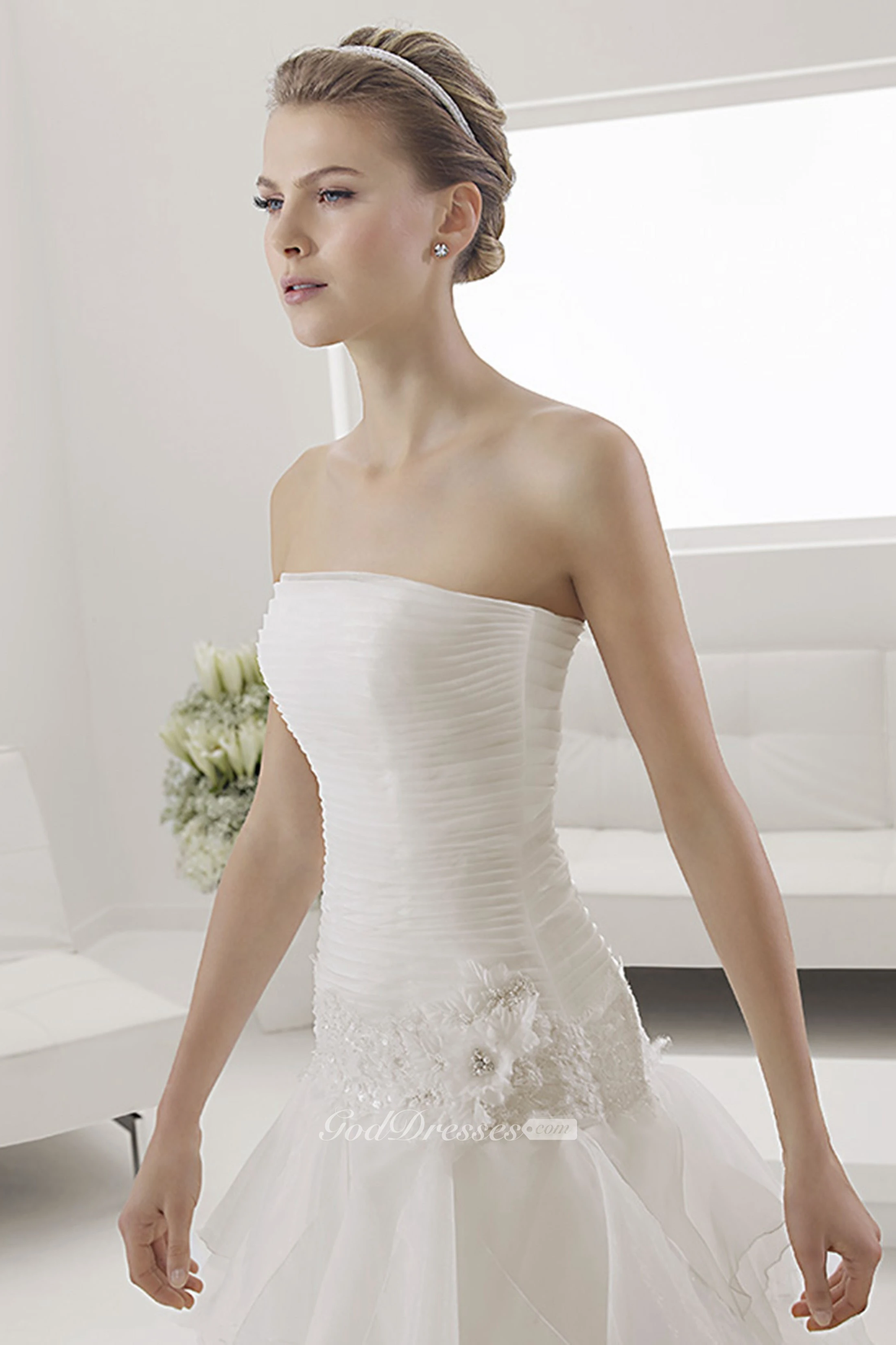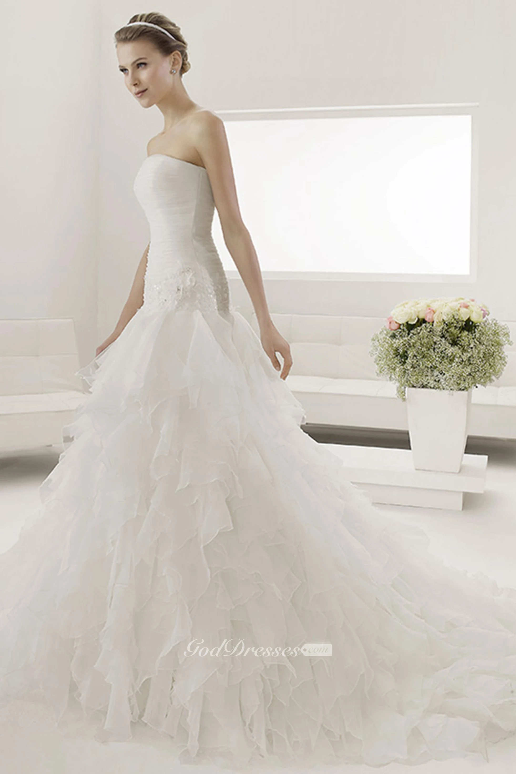 Strapless Ruched Bodice Mermaid Bridal Gown With Tiered Skirt