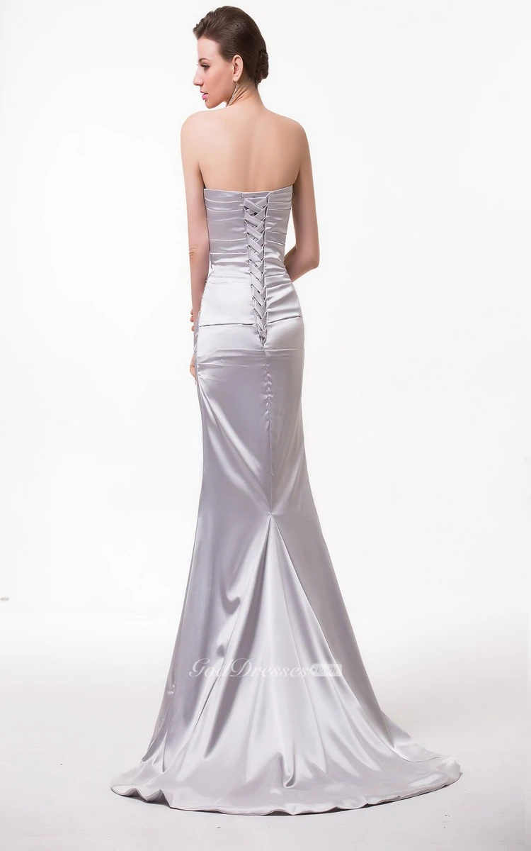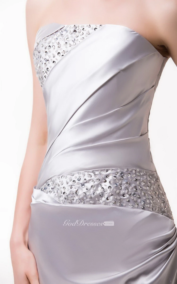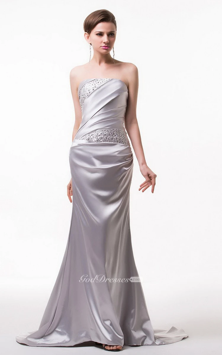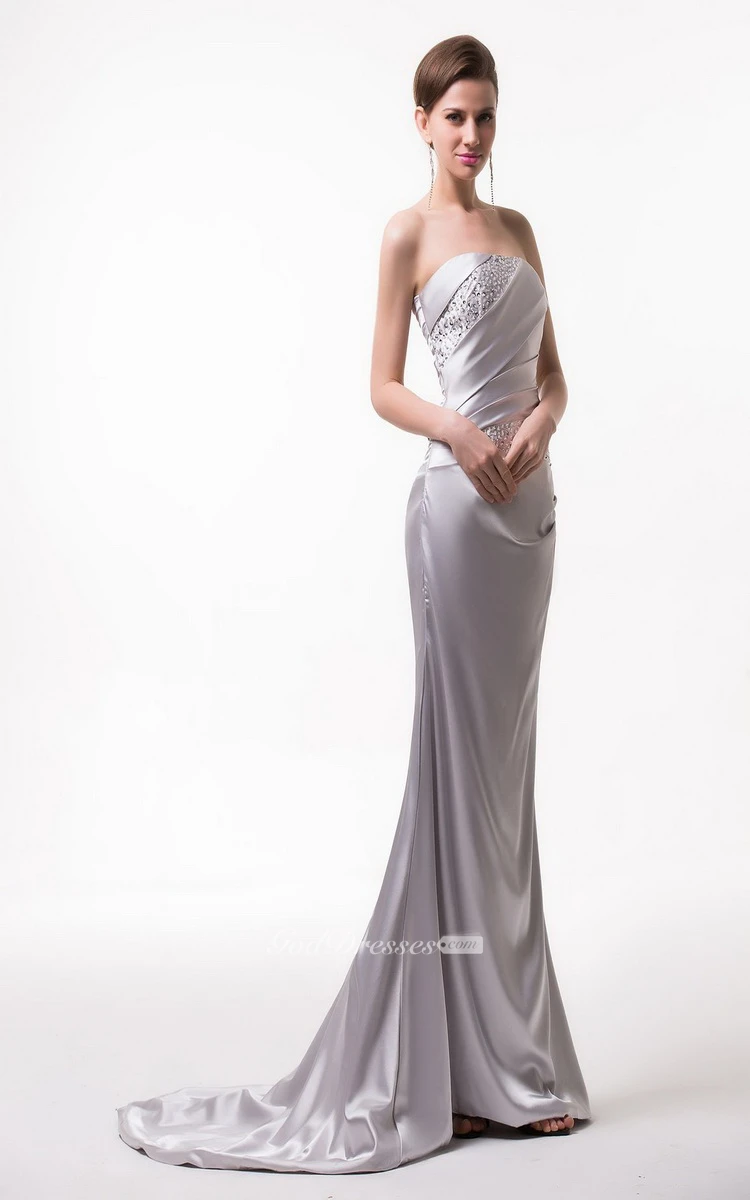 Strapless Satin Gown With Asymmetrical Ruching and Beading