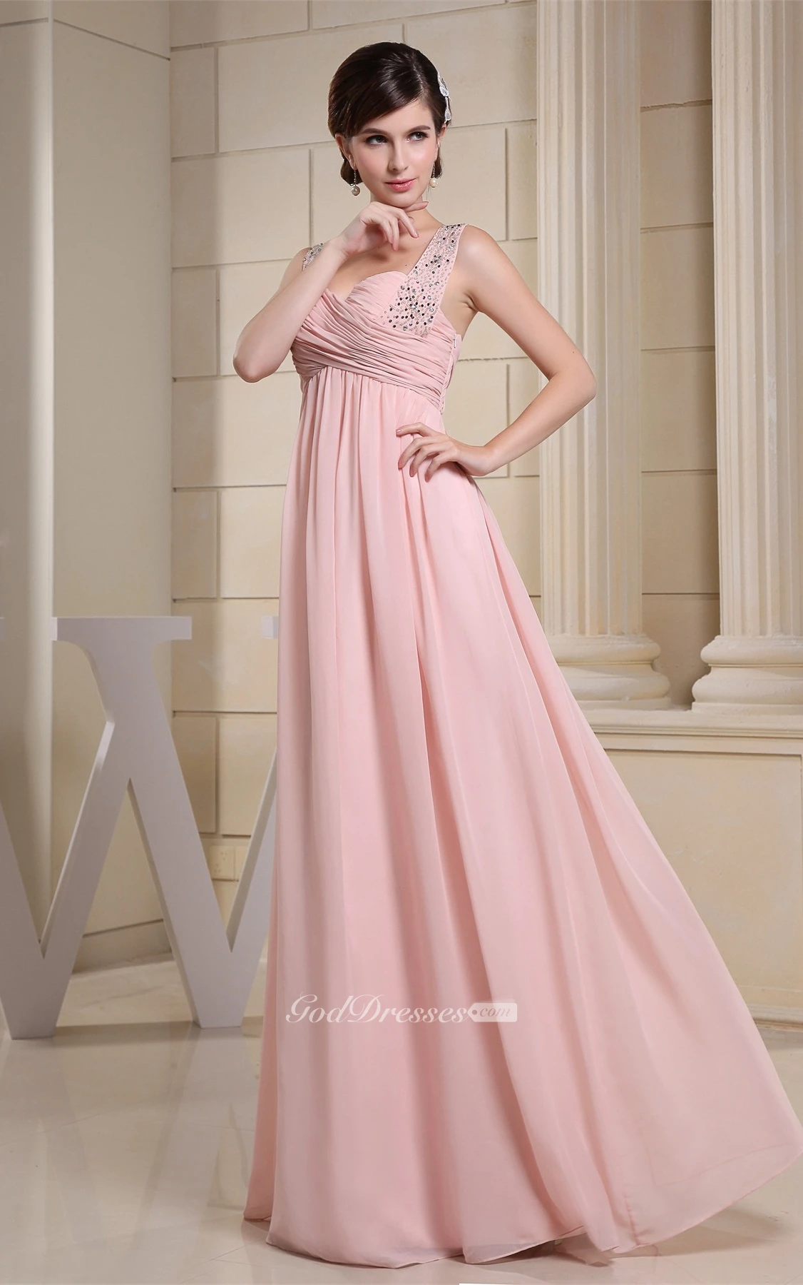 Strapped Empire Chiffon Crystal Detailing and Dress With Pleats