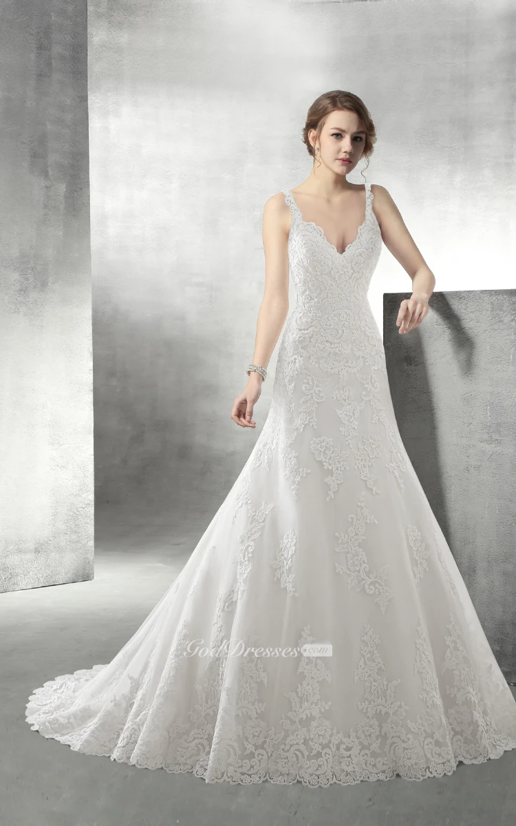 Strappy V Neck Backless Lace Floor Length Wedding Dress
