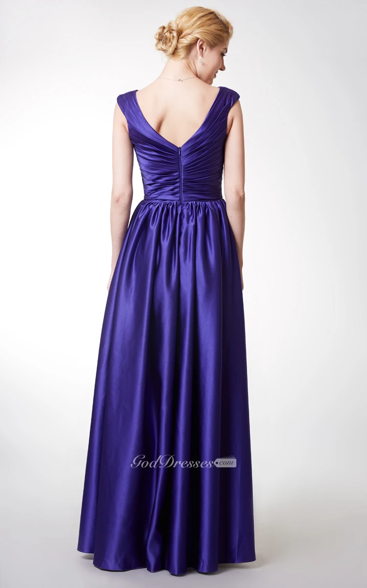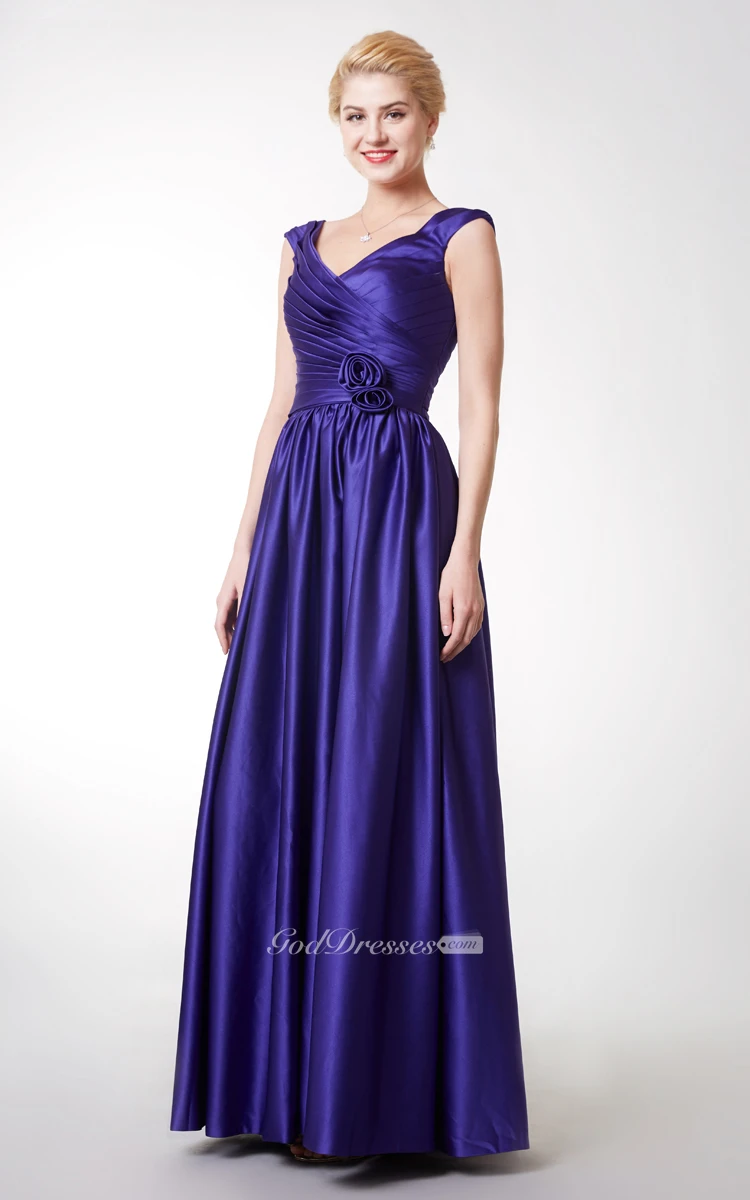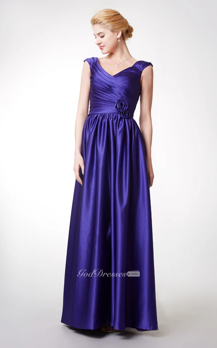 Stunning Cap-sleeved V-neck Long Satin Dress With Flowers
