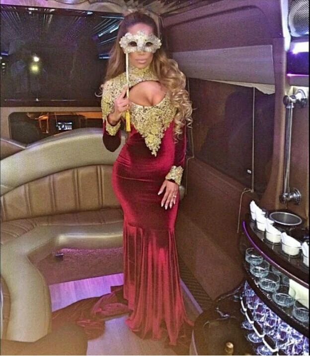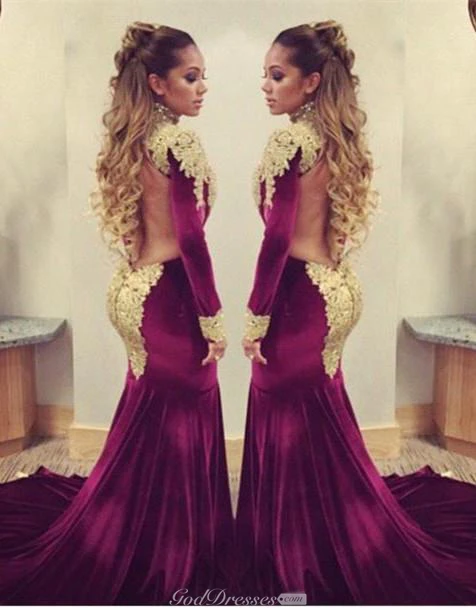 Stunning Long Sleeve Golden Appliques Evening Dresses Mermaid With Train