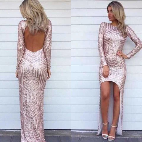 Stunning Long Sleeve Sequins Prom Dresses Open Back Hi-Lo Evening Gowns