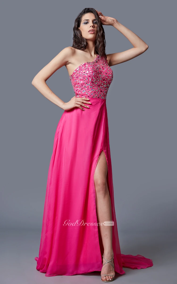 Stunning One-shoulder Multicolor-beaded Chiffon Prom Gown With Sheer Back