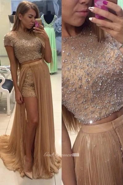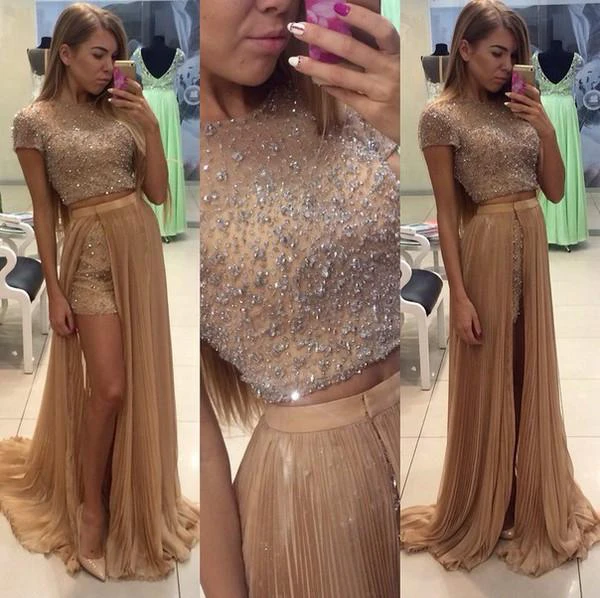 Stunning Two Pieces Prom Dresses Beadings Short Sleeve Split Party Gowns