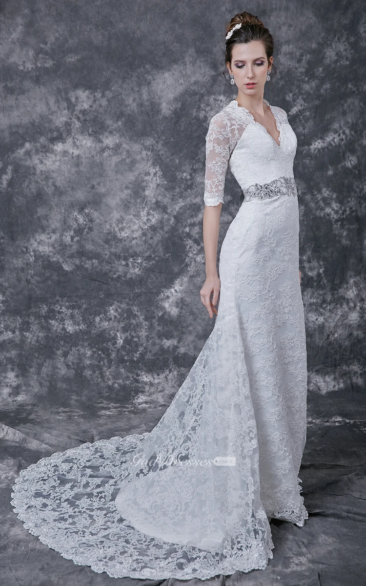 Stylish 3 4 Sleeve Long Lace Dress With Crystal Embellished Waist