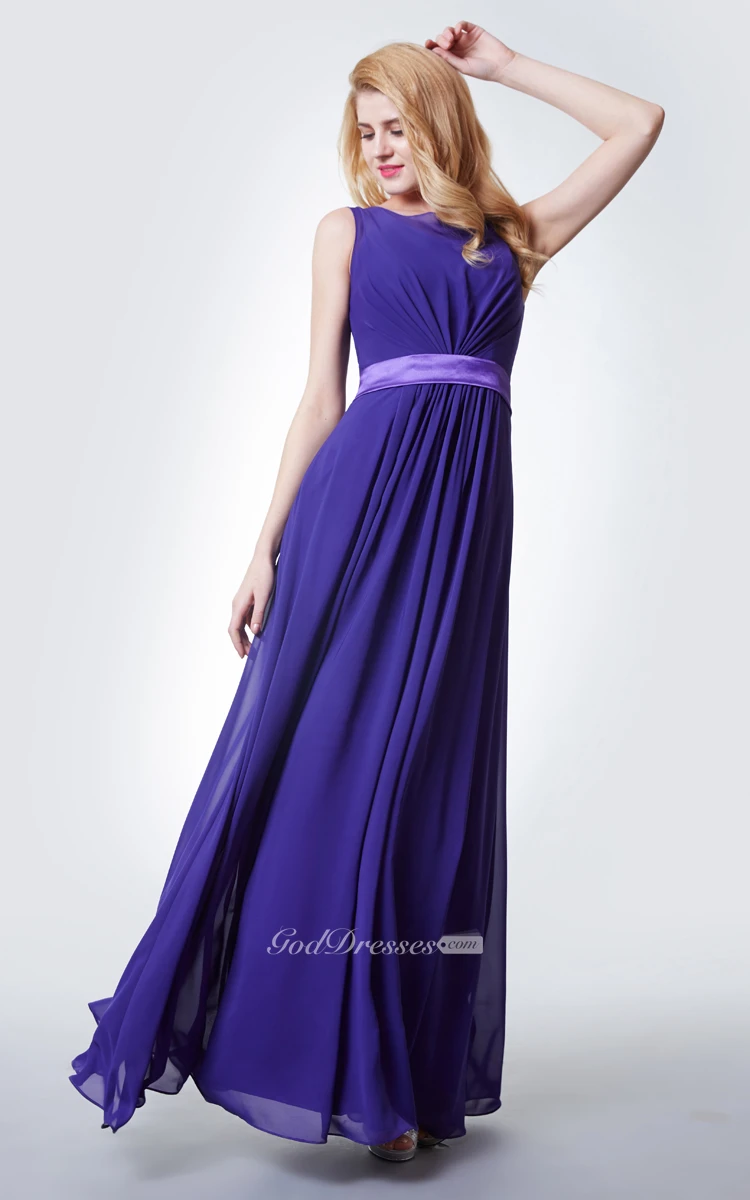 Stylish Cap-sleeved Long Chiffon Dress With Satin Sash