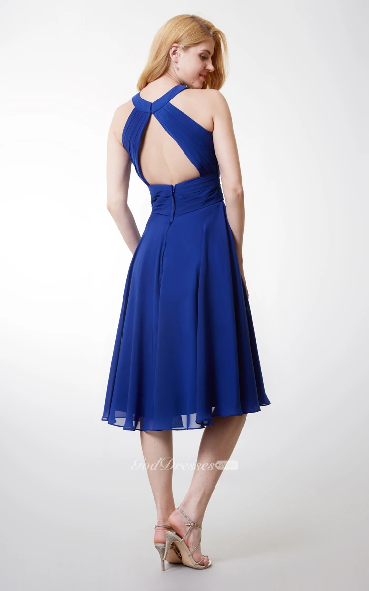 Stylish Halter Neck Pleated Knee Length Chiffon Dress
